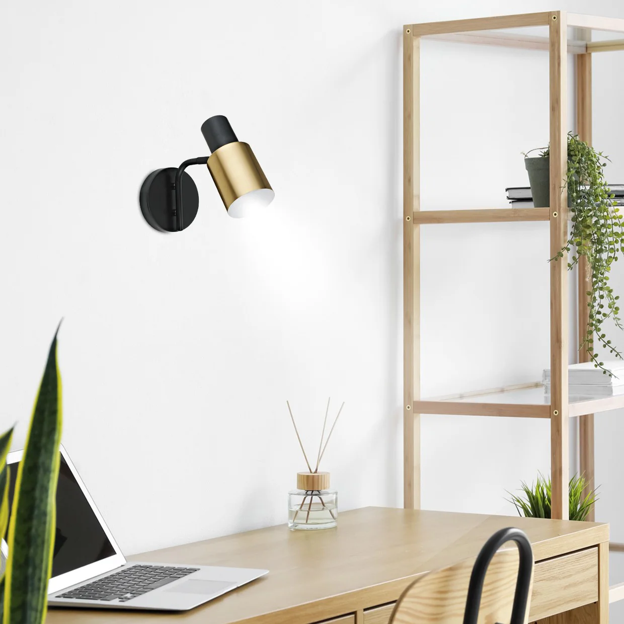 El aplique está fabricado en metal, con un acabado en latón y una base negra.
