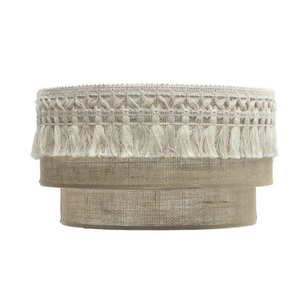 - Pantalla Doble de Tela de Saco con Pasamanería Beis: Proporciona una luz difusa general que crea atmósferas acogedoras y elegantes, ideal para estilos decorativos variados.