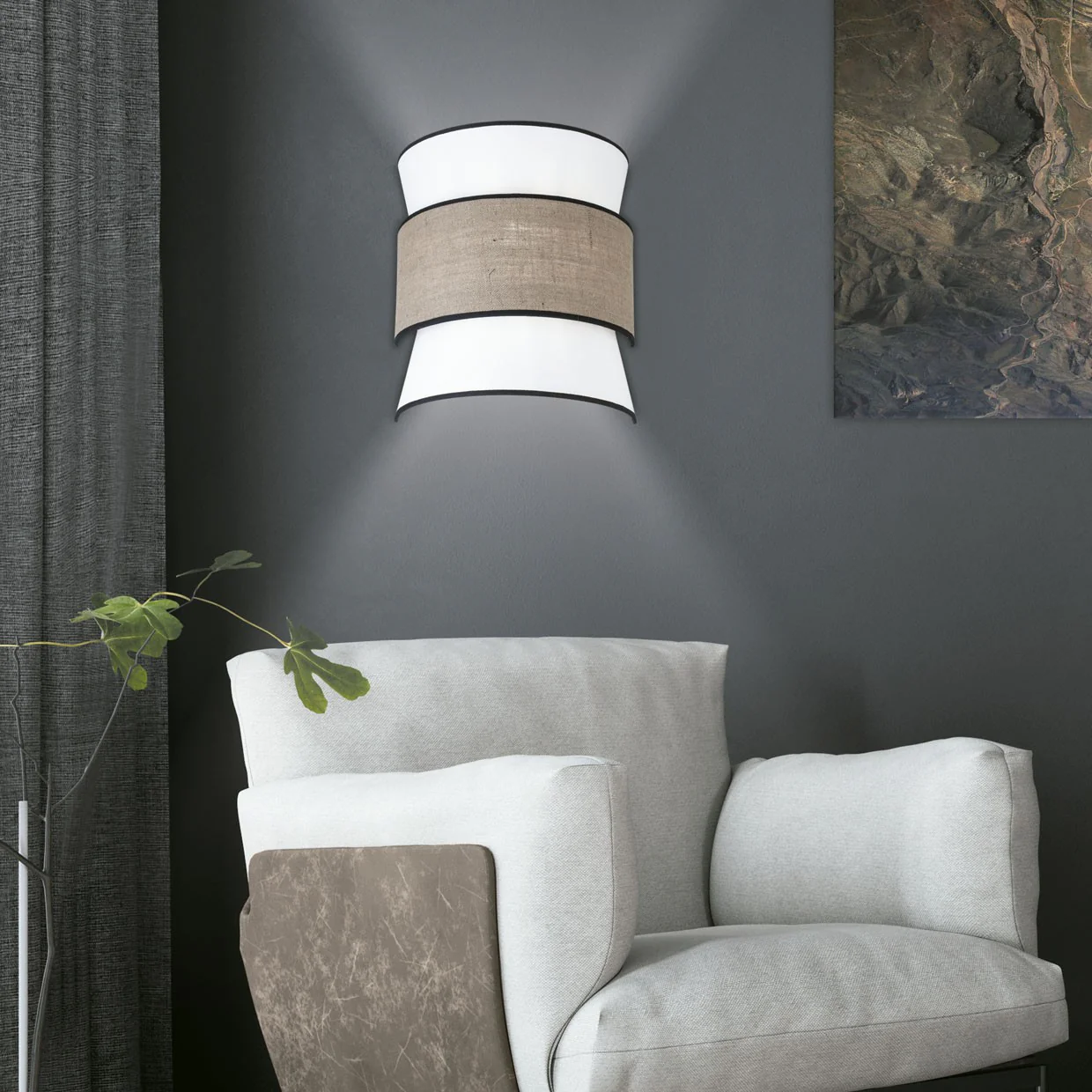El aplique Sabina, con su diseño único y fabricación de alta calidad, se convertirá en el punto focal de tu decoración. Su estructura en tela blanca, combinada con una banda textil saco en color tostado, crea un contraste visualmente atractivo y atemporal. Compatible con bombillas LED E-27 (2 x E-27 no incluidas), te permite personalizar la intensidad y el color de la luz según tus preferencias.