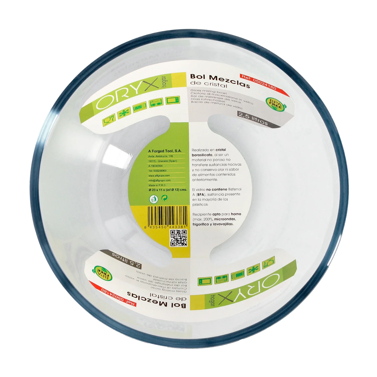 • Cristal de borosilicato de alta calidad, que al ser un material no poroso, no transfiere sustancias nocivas, y no conserva olor ni sabor de alimentos contenidos anteriormente