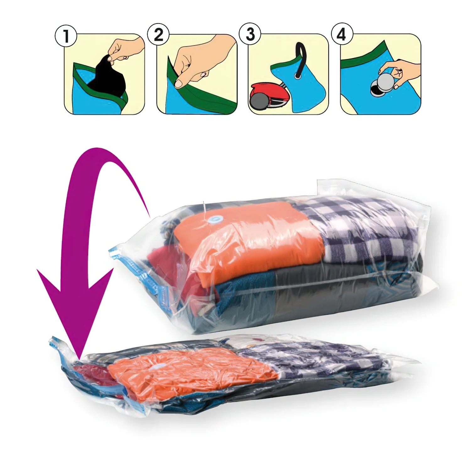 - Ideal para guardado y ordenación de ropa, almohadas, ropa de cama, edredones, mantas, nordicos, cojines, etc. facilitando el almacenamiento en casa, cambio de armario, el viaje y la mudanza