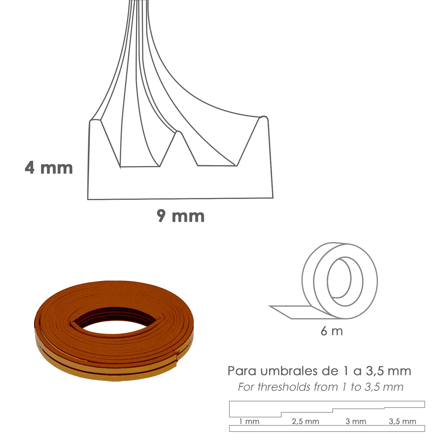Burlete Caucho Marron Rollo 6 Metros. x 9 mm. Sellador Ventanas y Puertas. Aisla Del Ruido. Para Umbrales de 1 A 3,5 mm.