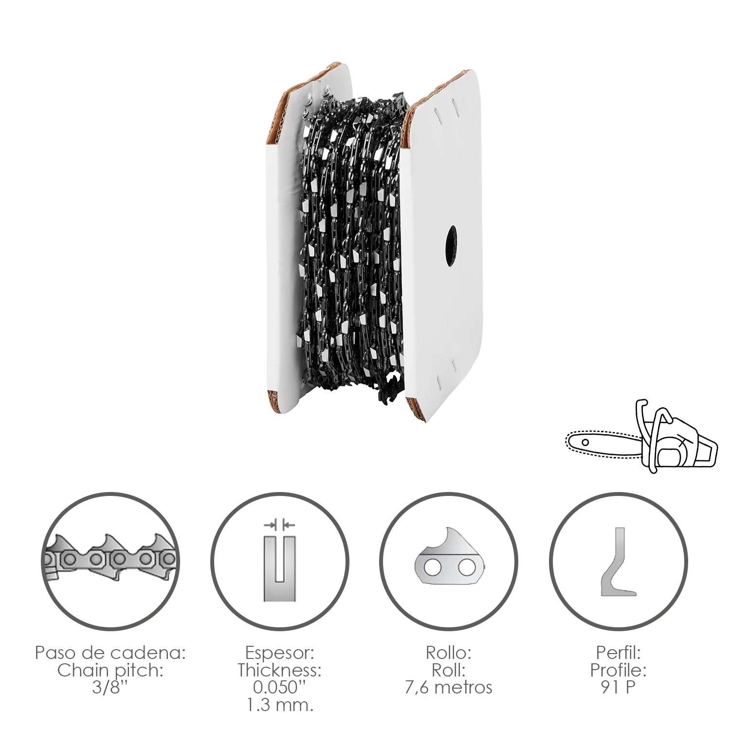 Cadena Motosierra 3/8″ / 0.050″ 1,3 mm. / 91 P / Rollo 7,6 metros.