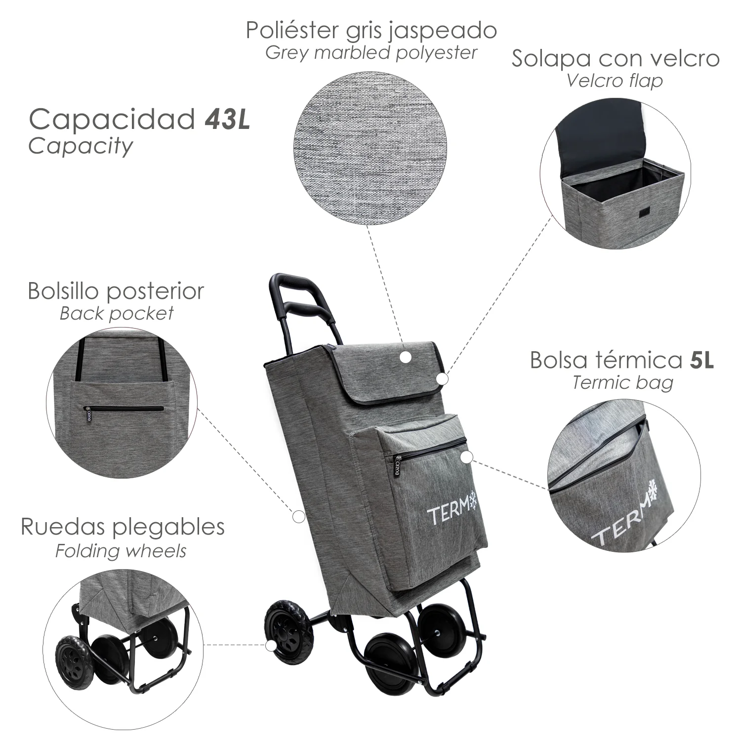 – Carro de la compra con cuatro ruedas (dos plegables), puede ser empujado o arrastrado.