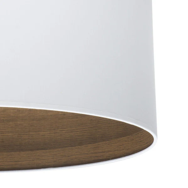 - Materiales Premium (Metal/Textil): Armazón en níquel resistente y pantalla textil en blanco con madera oscura que aseguran durabilidad y un estilo elegante duradero.