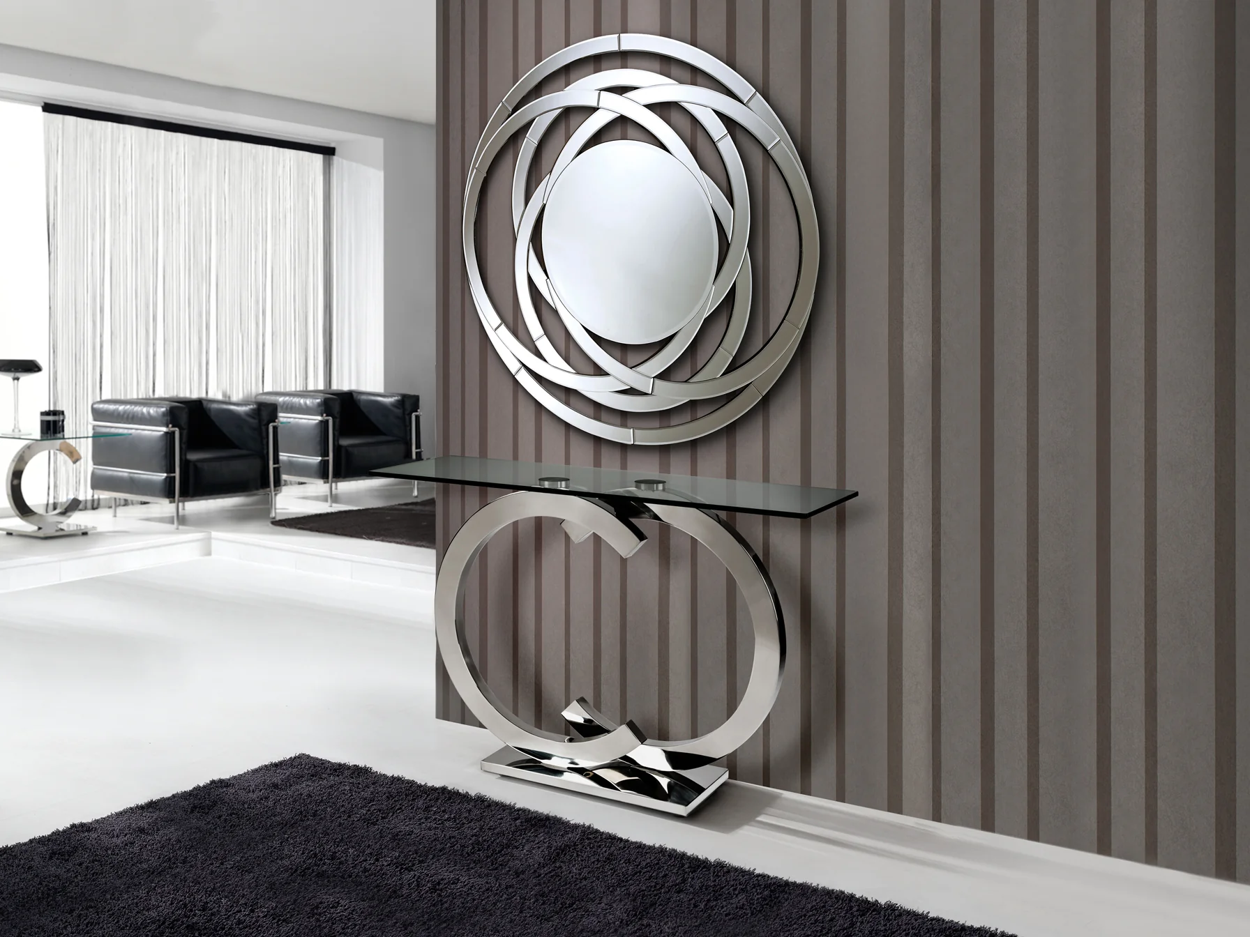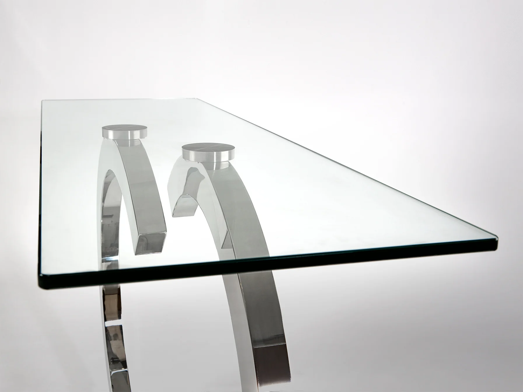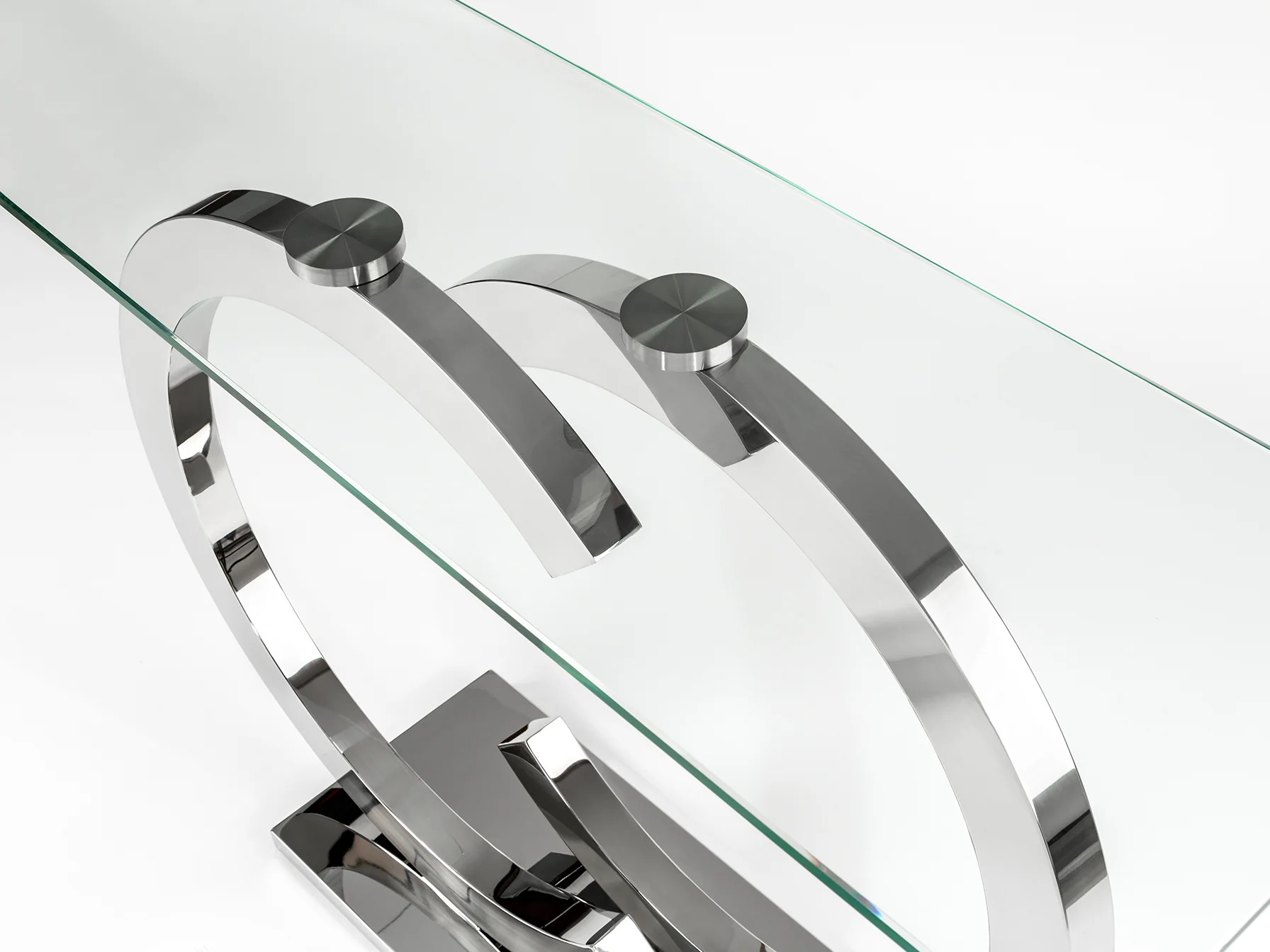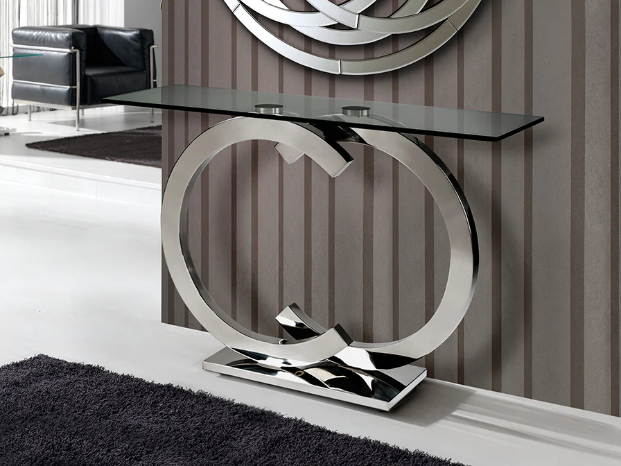 La consola Casandra destaca por su robustez y elegancia. La estructura de acero inoxidable pulido a alto brillo ofrece una base sólida y duradera, mientras que la tapa de cristal de seguridad de 12 mm de grosor, con canto pulido, aporta un toque de sofisticación y seguridad. Su diseño minimalista se adapta a cualquier estilo decorativo, desde los más clásicos hasta los más vanguardistas. Esta consola no solo es bonita, sino también funcional, ofreciendo una superficie amplia y resistente para colocar objetos decorativos, libros o incluso una lámpara.