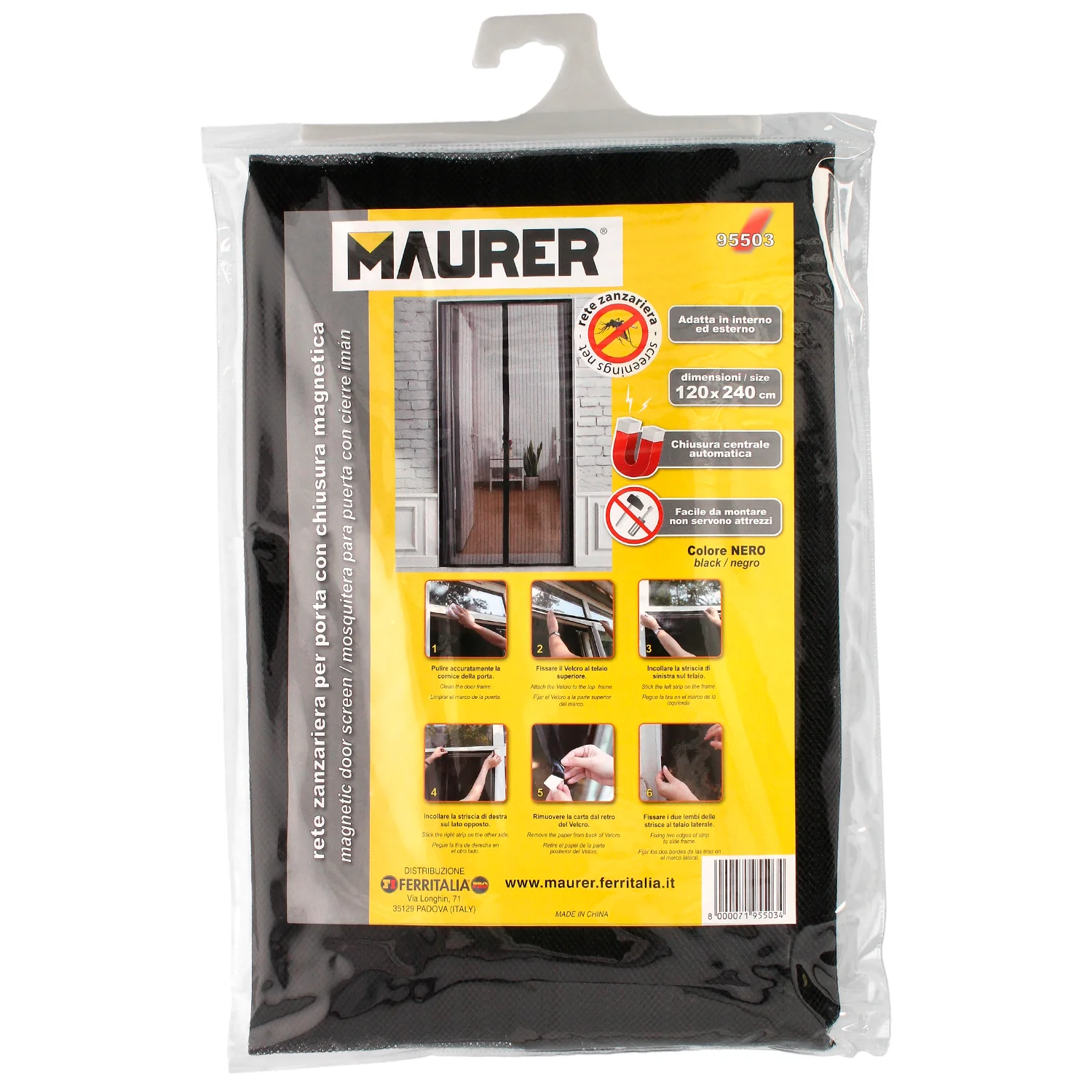 Cortina Mosquitera 1. Limpie el marco de la puerta. 2. Fijar el velcro en la parte superior del marco. 3. Pegar la parte del velcro de la mosquitera al velcro del marco de la puerta. 4. Para los laterales pegar el velcro a la mosquiera y despues al marco de la puerta de la marca MAURER.