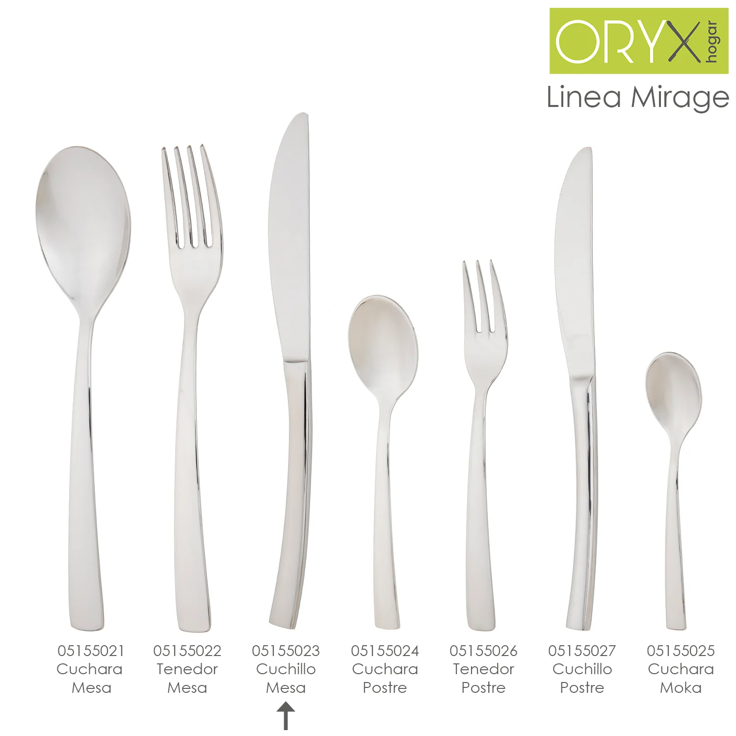 Más información y guía de uso: Cuberterías en acero inoxidable con diseño equilibrado; juegos por servicios o piezas sueltas para vestir la mesa. Este producto pertenece a la categoría Cubiertos serie Mirage de VicHome, donde encontrarás productos similares y sus variantes.