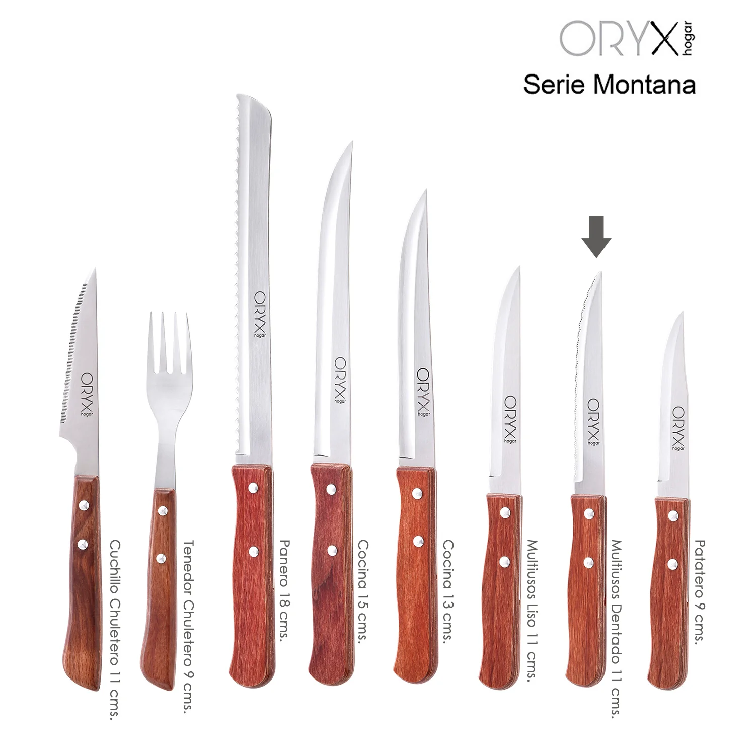 - La serie Montana se define por su parecido con maderas naturales, fabricados en acero inoxidable, de hoja estrecha y mango de madera prensada, se trata de un diseño clásico, funcional y resistente, caracteristicas que hacen que su duración sea larga, incluso con usos frecuentes