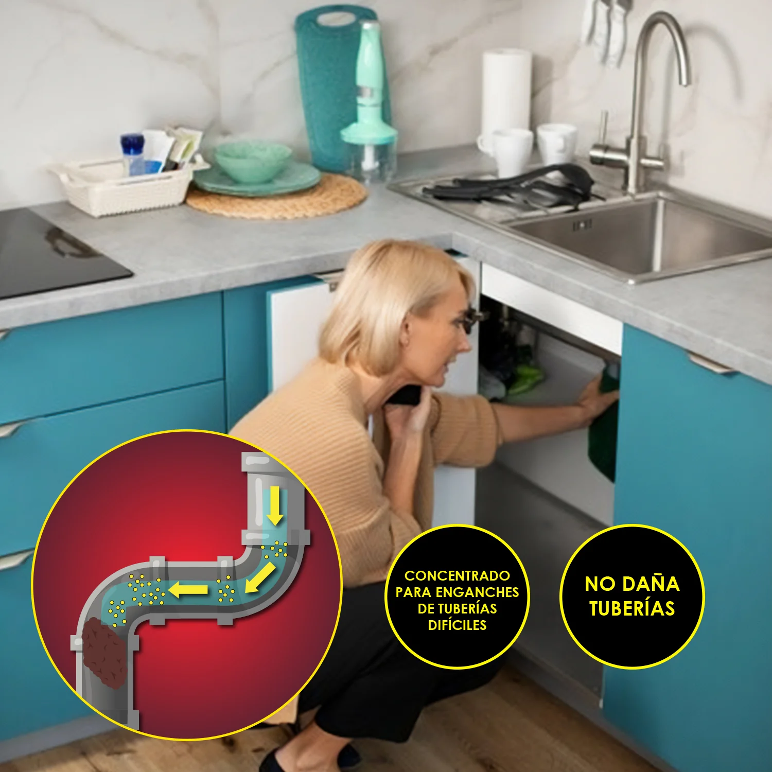 - Descompone y elimina instantáneamente todas las sustancias (pelos, grasa, jabón, etc. ) que obstruyen las tuberías sin dañarlas