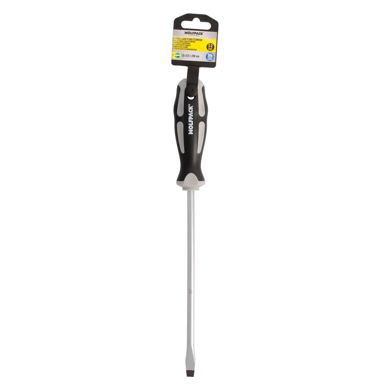 Destornillador Plano Estampado Acero S2 Mango TPR Bimaterial. Medida 1,6 x Ø 8,0 x 200 mm. DIN5265