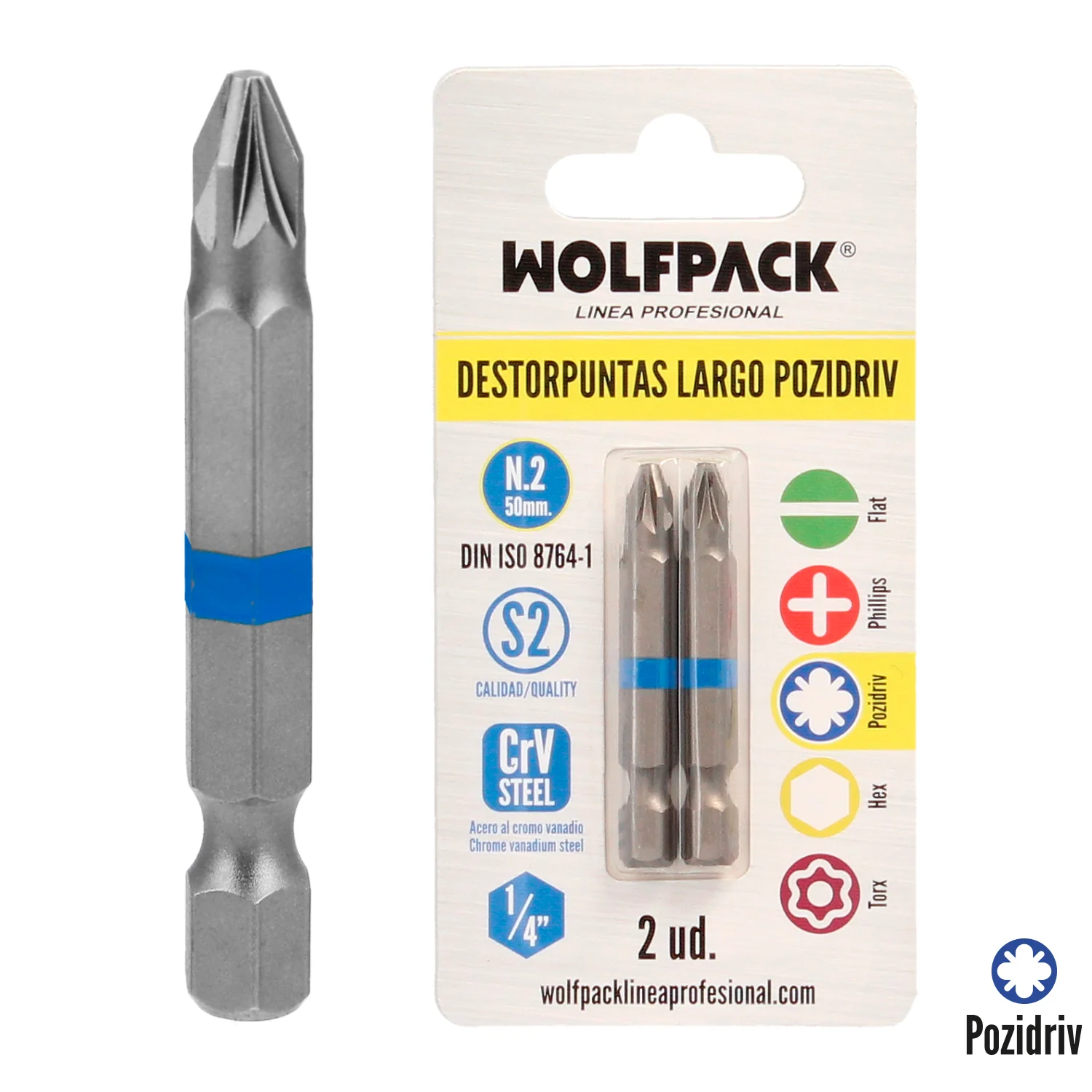 Destorpuntas Largo Pozidriv Nº 2 (2 Piezas) Acero S2 al Cromo Vanadio. Puntas Hexagonales, Destorpuntas,