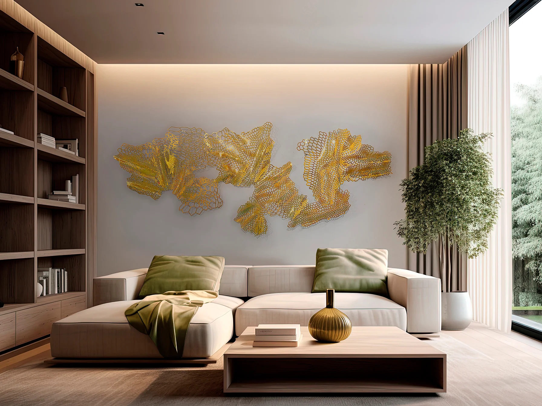La escultura de pared Drako no es solo un objeto decorativo, es una declaración de intenciones. Su diseño geométrico en malla de acero dorado brillante captura la luz y la mirada, convirtiendo cualquier pared en un punto focal de sofisticación y modernidad. Ideal para salones, recibidores o incluso espacios de trabajo que buscan un toque distintivo y elegante. Drako redefine el concepto de decoración, fusionando arte y diseño en una pieza única.