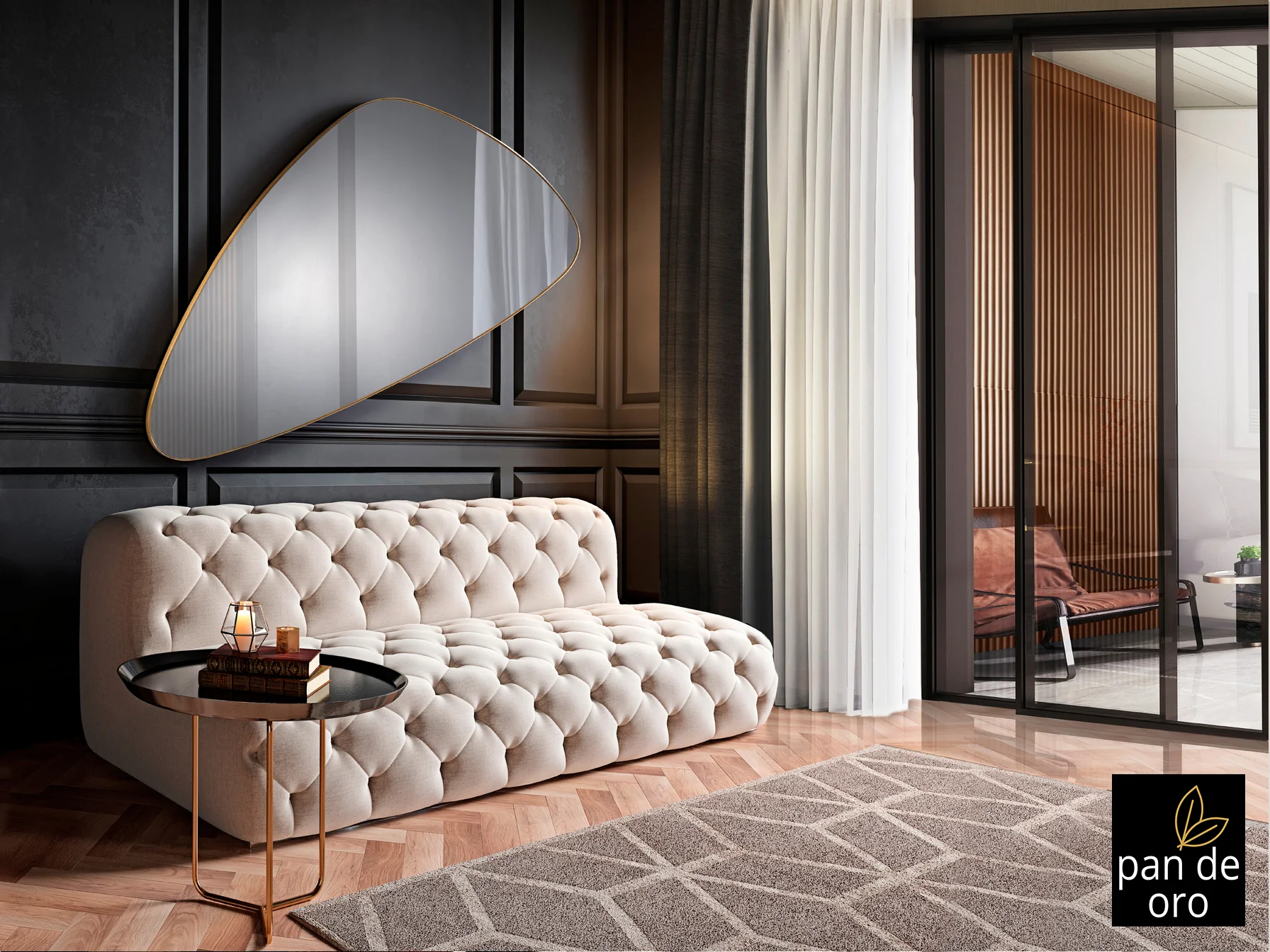El espejo Orio combina la estética audaz con materiales de calidad. El marco de DM proporciona una base sólida y duradera, mientras que el acabado en pan de oro añade un brillo cálido y lujoso. Su diseño triangular no solo es visualmente impactante, sino que también ofrece una perspectiva única del espacio, jugando con las líneas y la luz para crear una sensación de amplitud y dinamismo.