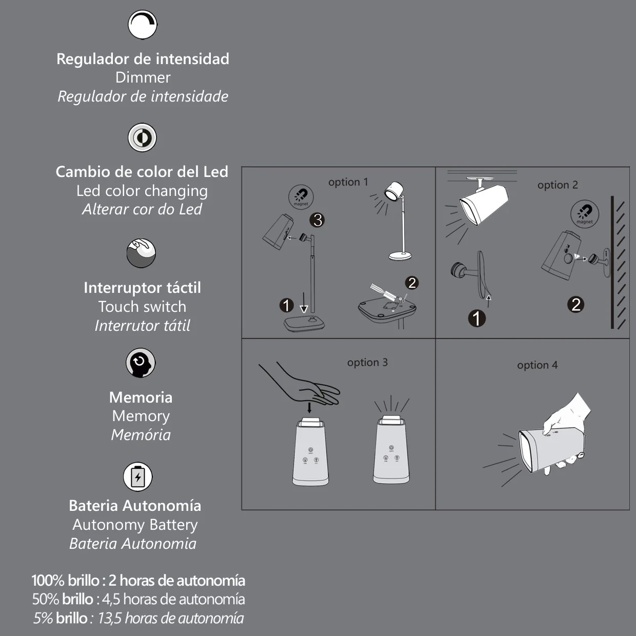 - Autonomía: 100% brillo (2h), 50% brillo (4,5h), 5% brillo (13,5h)