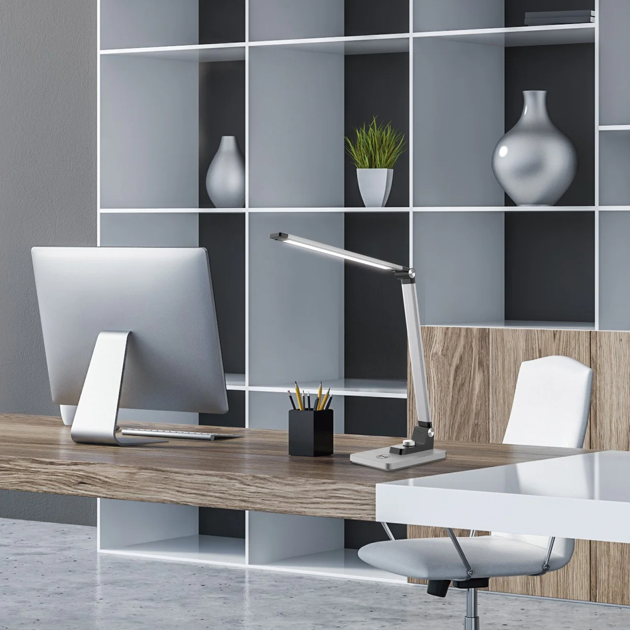 Descubre el FLEXO LED NELSON PLATA, una pieza excepcional de AJP / Alemar, diseñada para iluminar tu espacio con estilo y funcionalidad. En LUZGURU te ofrecemos la mejor selección de lámparas de diseño. Este flexo LED, de la prestigiosa marca AJP / Alemar, combina tecnología de vanguardia con un diseño moderno y sofisticado. Su elegante acabado en plata se integra perfectamente en cualquier ambiente. La serie NELSON de AJP / Alemar se caracteriza por su calidad, durabilidad y diseño innovador. Experimenta la diferencia de AJP / Alemar y compra tu flexo LED ahora mismo en LUZGURU. El flexo LED Nelson es una solución de iluminación perfecta para tu escritorio, mesita de noche o cualquier rincón que necesite una luz cálida y eficiente. Su diseño plegable te permite ajustar la posición de la luz a tu gusto, mientras que el regulador de intensidad rotatorio te proporciona un control preciso del brillo. Además, la función de cambio de temperatura de color te permite adaptarla a tus necesidades, desde una luz cálida y relajante hasta una luz fría y energizante. La carga inalámbrica rápida es otra de sus ventajas, permitiéndote cargar tu dispositivo móvil cómodamente. No esperes más y disfruta de la comodidad y el estilo del flexo LED Nelson de AJP / Alemar. ¡Compra en LUZGURU!