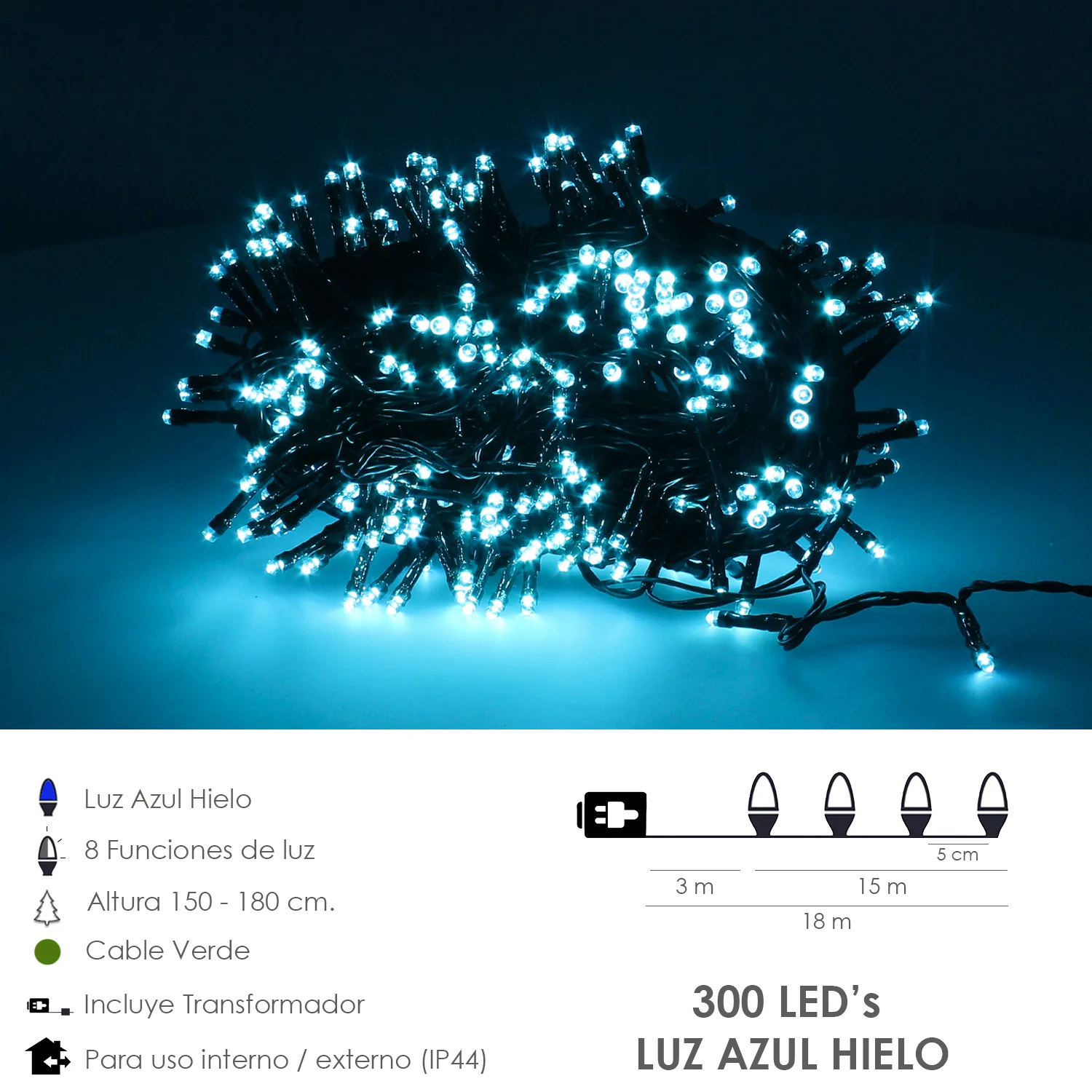 Guirnalda Luces Navidad 300 Leds Color Azul Hielo. Luz Navidad Interiores y Exteriores Ip44