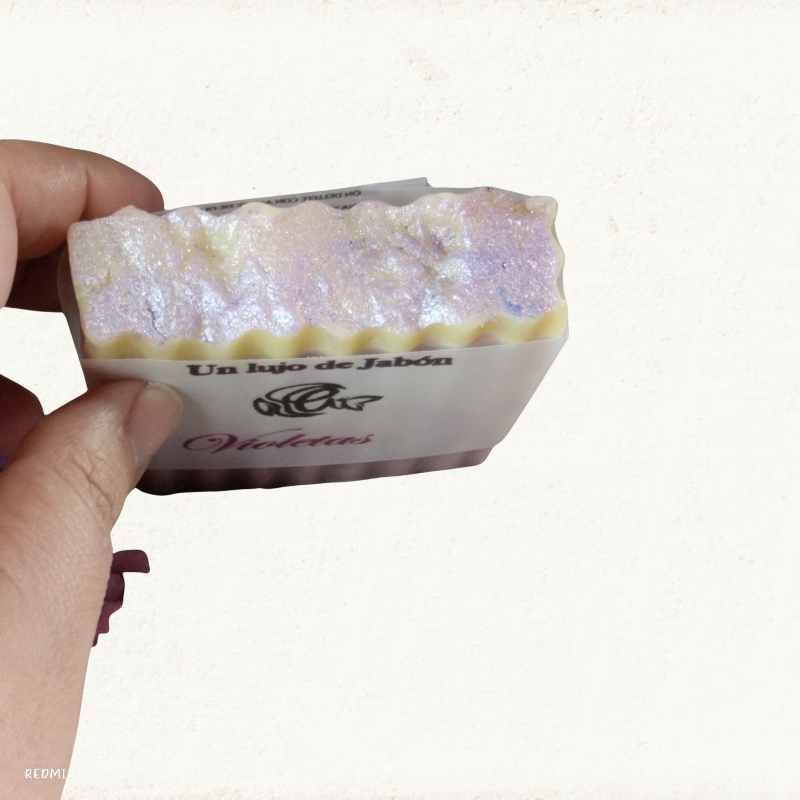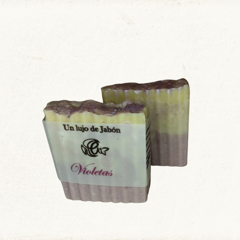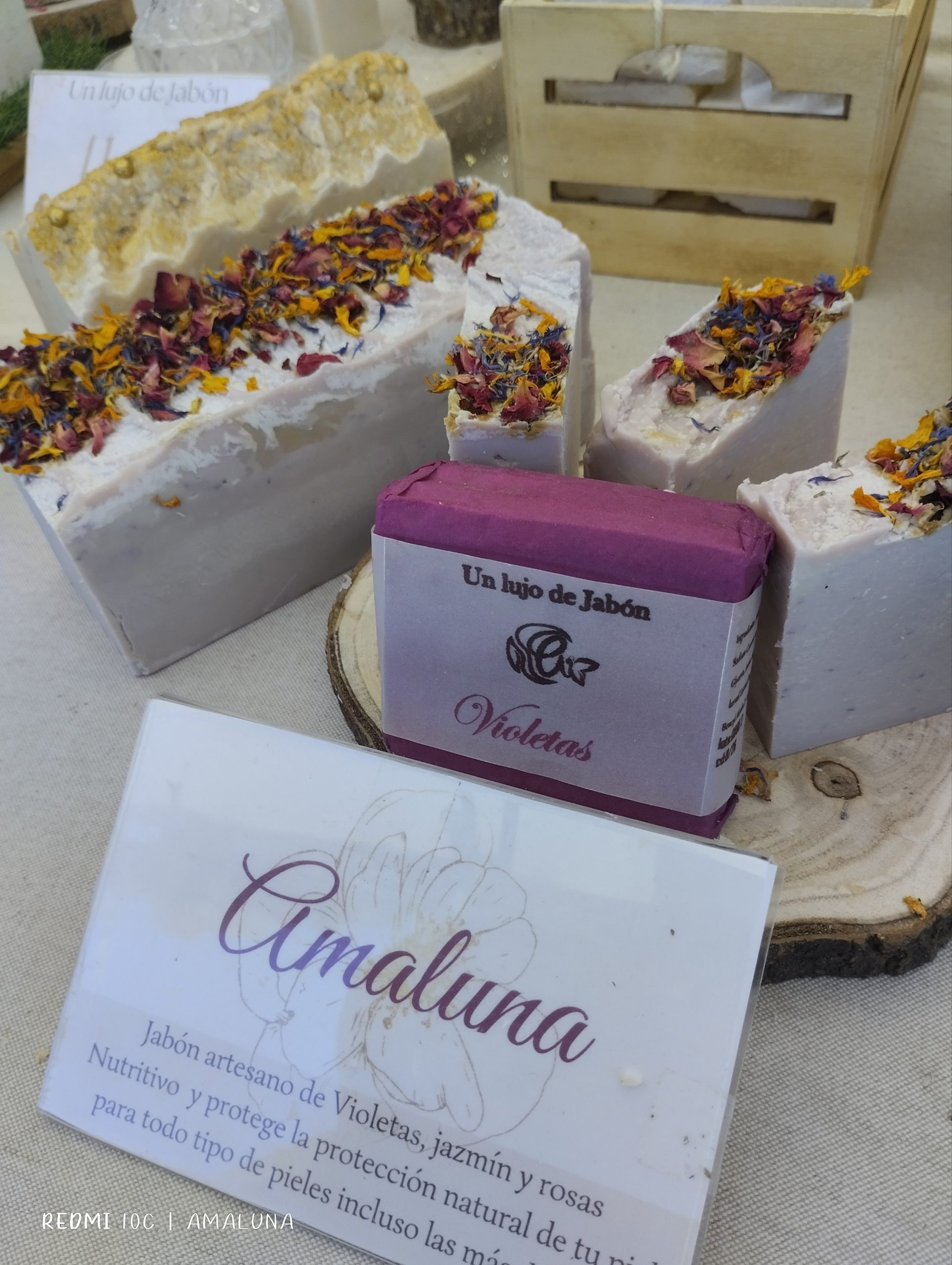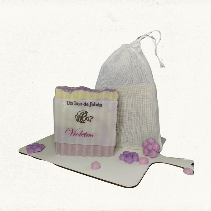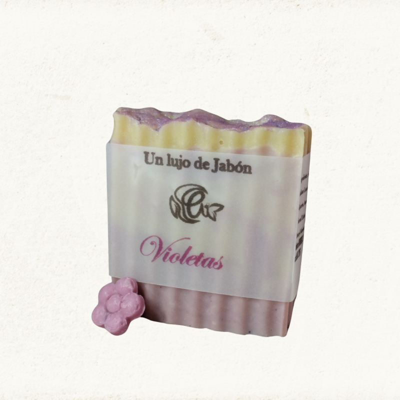 Jabón artesano de flores y leche Materna. Nutritivo para pieles secas con aroma a caramelos de violetas.