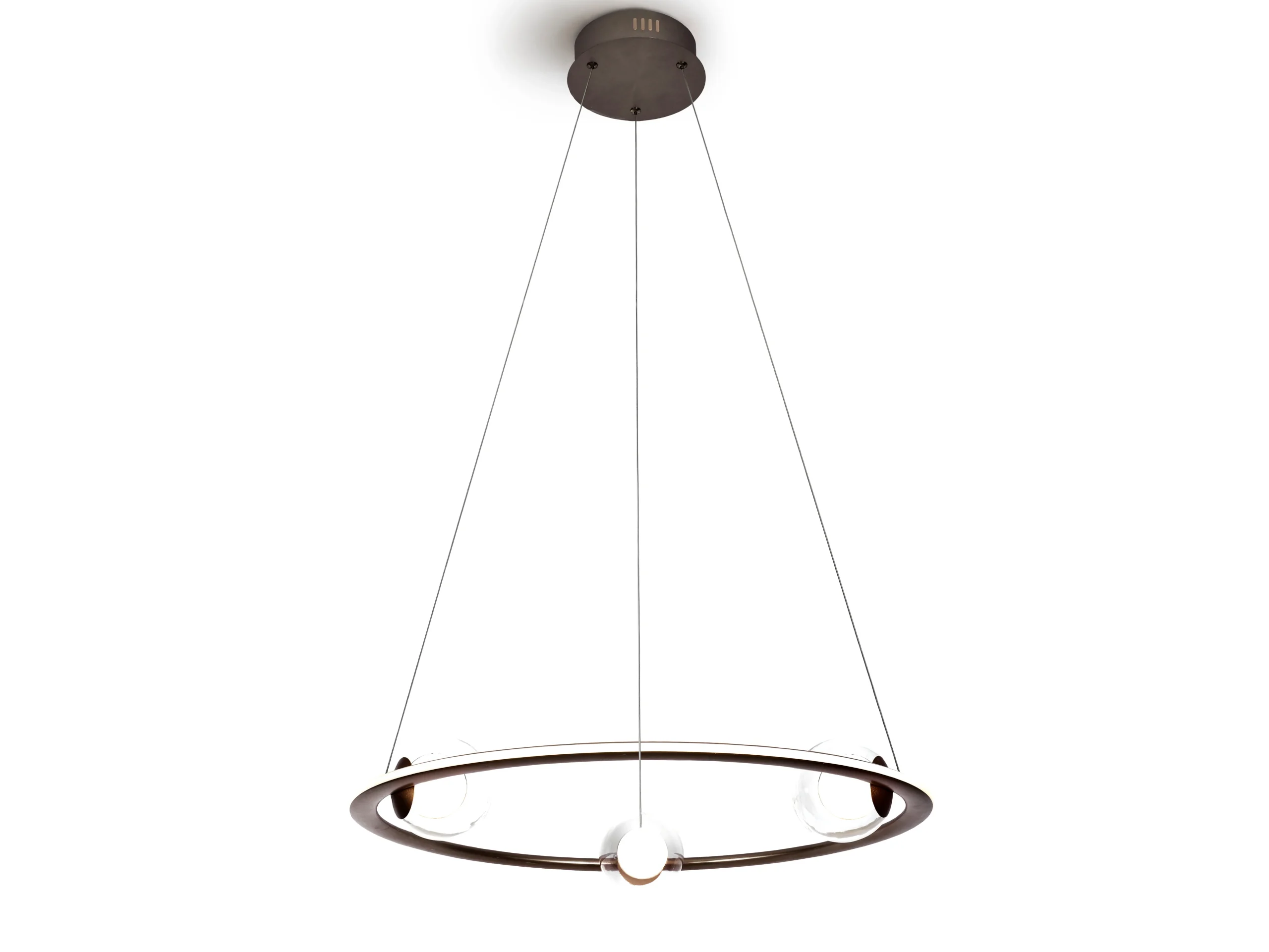 La lámpara Tirsa combina acero, aluminio y cristal opal para ofrecer una iluminación difusa y agradable. Su acabado en bronce anódico aporta un toque de calidez y sofisticación, mientras que las esferas de cristal transparente con interior opal distribuyen la luz de manera uniforme. La tira LED integrada proporciona una luz de 2700 lúmenes, ideal para crear ambientes relajantes y acogedores.