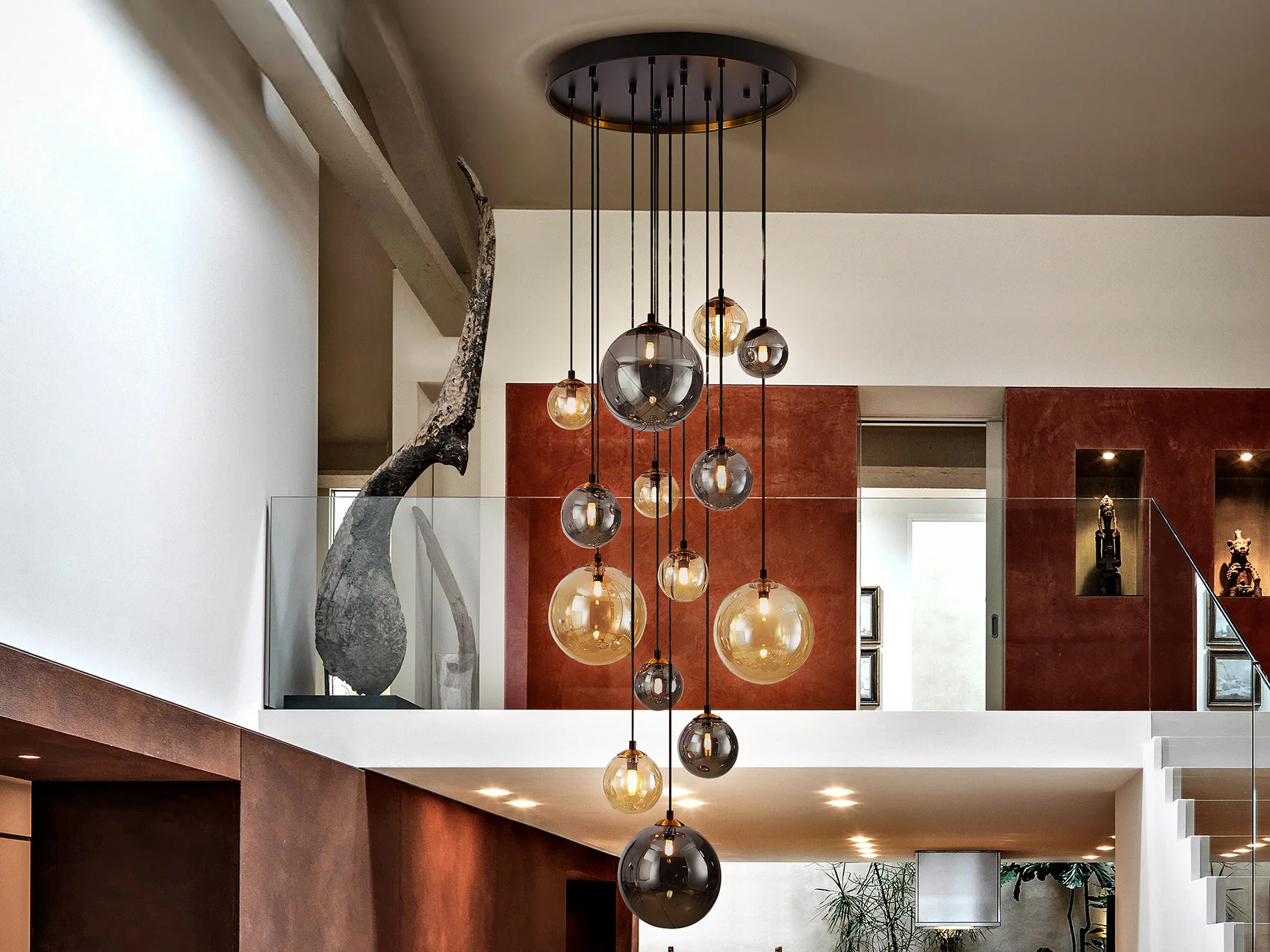 La lámpara Dark destaca por su estructura de metal robusto con un elegante acabado en negro mate y detalles en latón satinado, que aportan un toque de lujo discreto. Las tulipas de cristal esféricas, disponibles en tonos ámbar y gris smoke espejado, difunden la luz de manera suave y uniforme, creando una atmósfera envolvente. Su diseño regulable en altura permite adaptarla a diferentes espacios y necesidades, garantizando una iluminación perfecta en cada ocasión.
