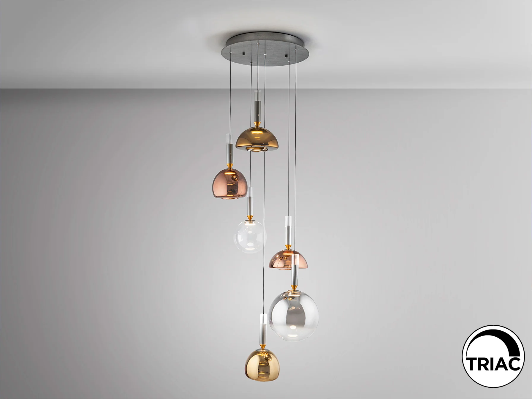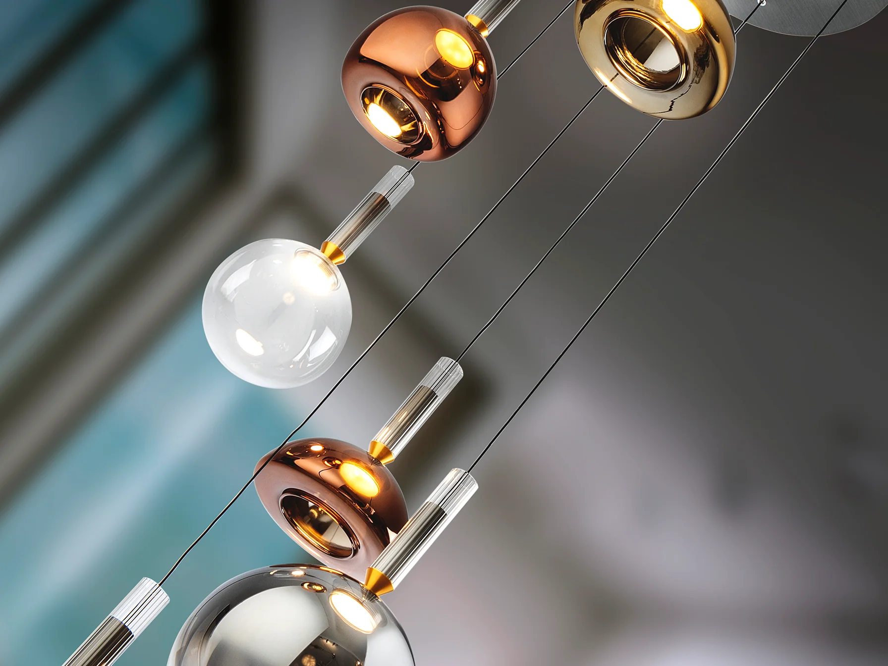 - Tulipas de cristal espejado en tonos variados que crean un ambiente único.