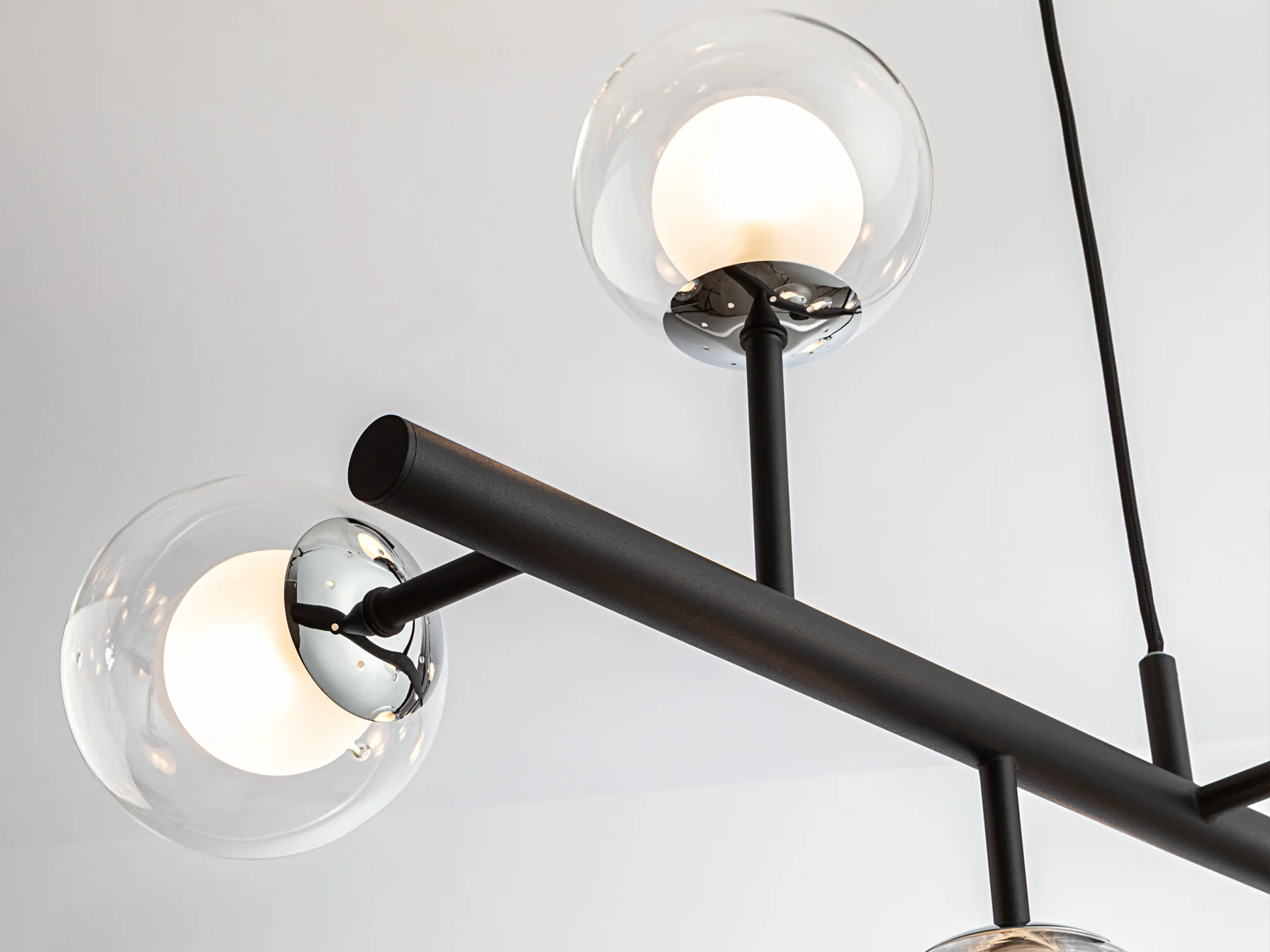 La lámpara Altais destaca por su estructura de metal resistente con un elegante acabado en negro mate y detalles cromados que aportan un brillo sutil. Las tulipas esféricas de doble cristal, con interior opal y exterior transparente, difunden la luz de manera uniforme, creando un ambiente cálido y acogedor. Su diseño moderno y sofisticado la convierte en una pieza atemporal que complementa cualquier estilo decorativo.