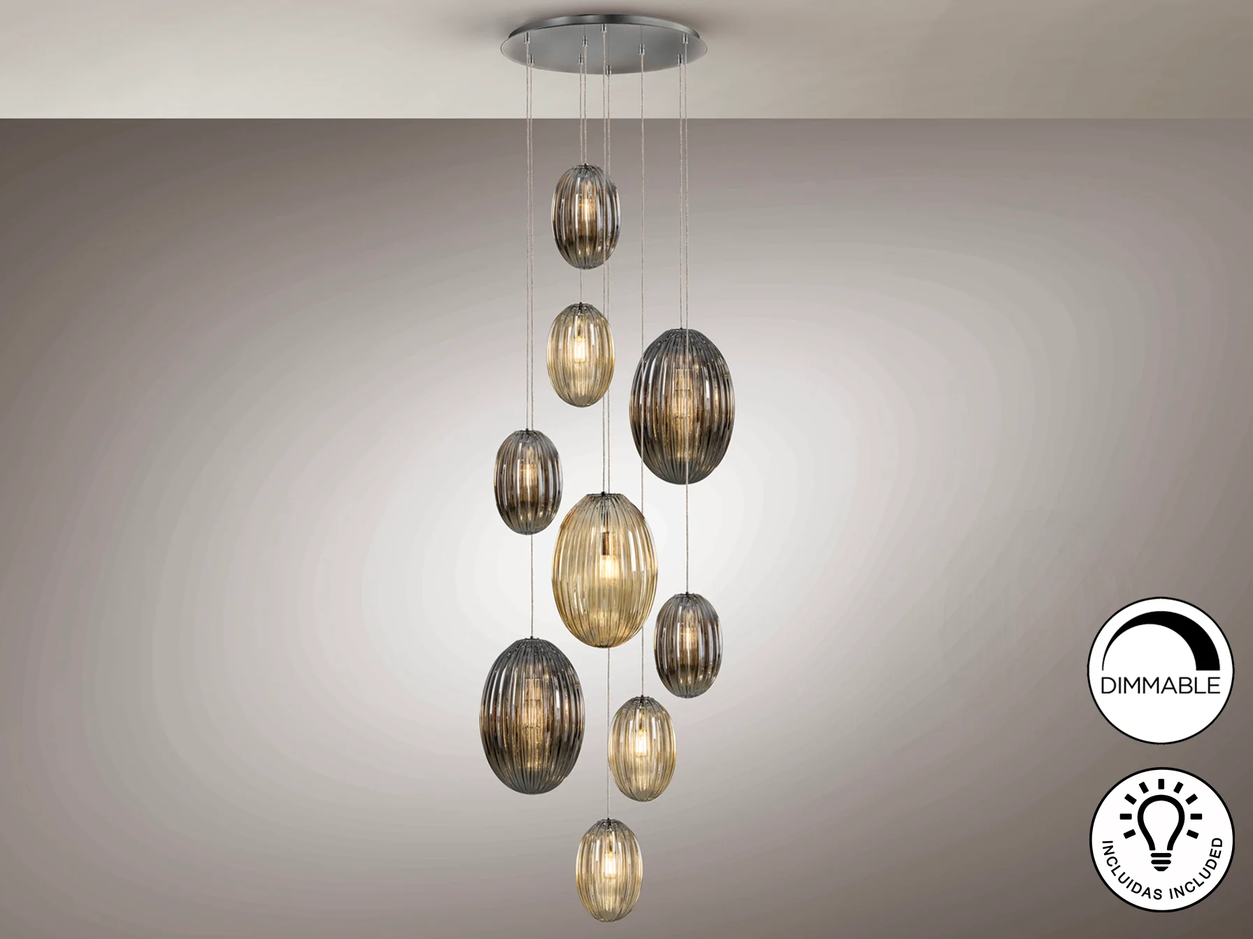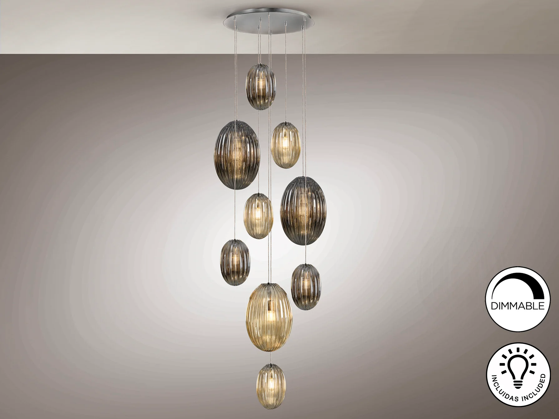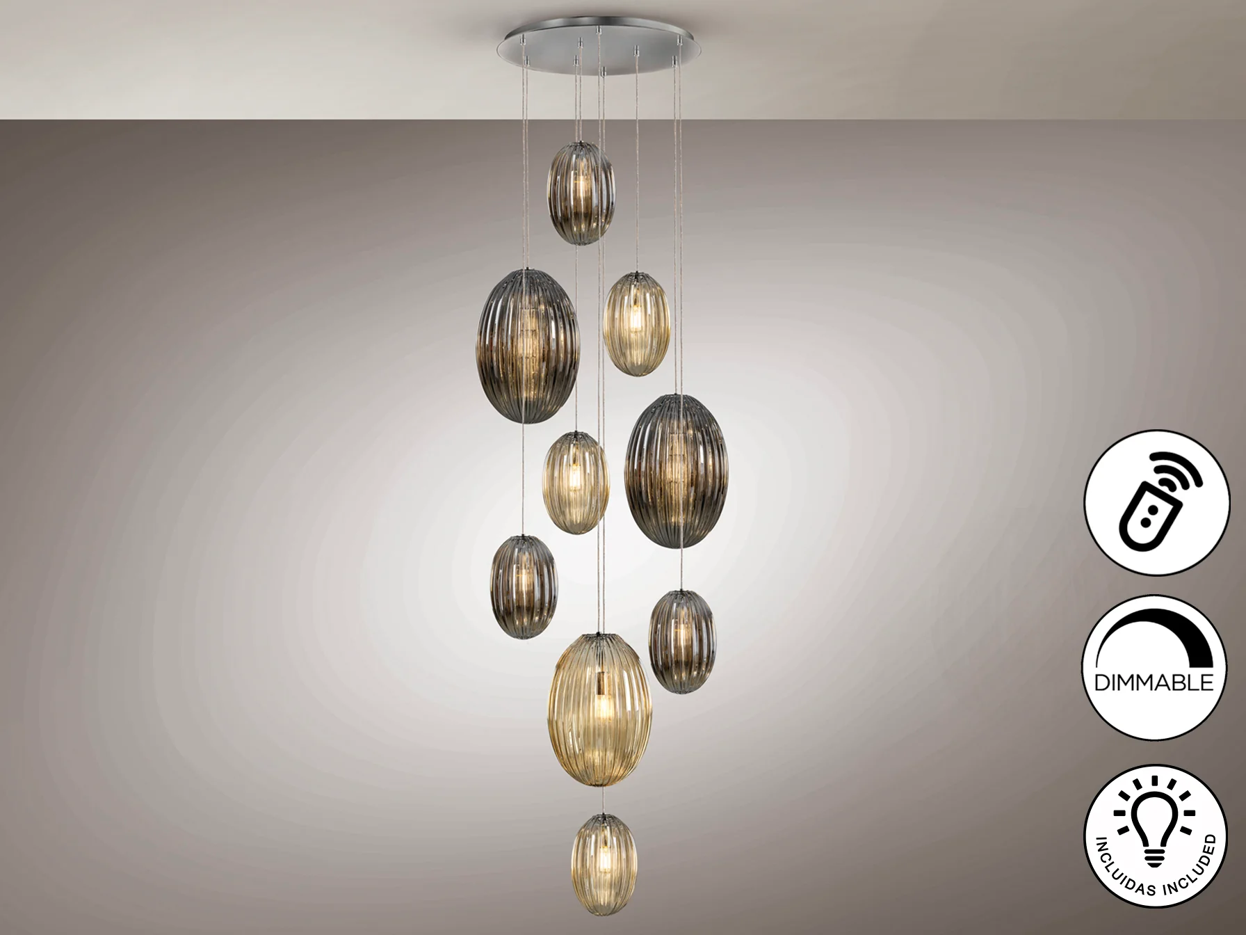 La lámpara Ovila destaca por la calidad de sus materiales y su cuidado diseño. El metal cromado aporta un toque moderno y elegante, mientras que los cristales en tonos coñac y smoke crean un juego de luces y sombras que realza la belleza de cualquier espacio. Las tulipas combinadas, grandes y pequeñas, añaden dinamismo y originalidad al conjunto. La altura regulable permite adaptar la lámpara a diferentes necesidades y preferencias.
