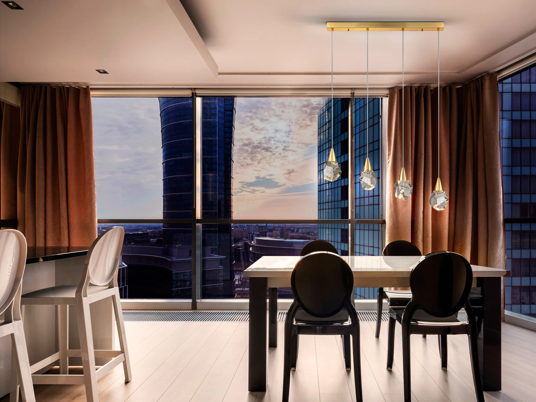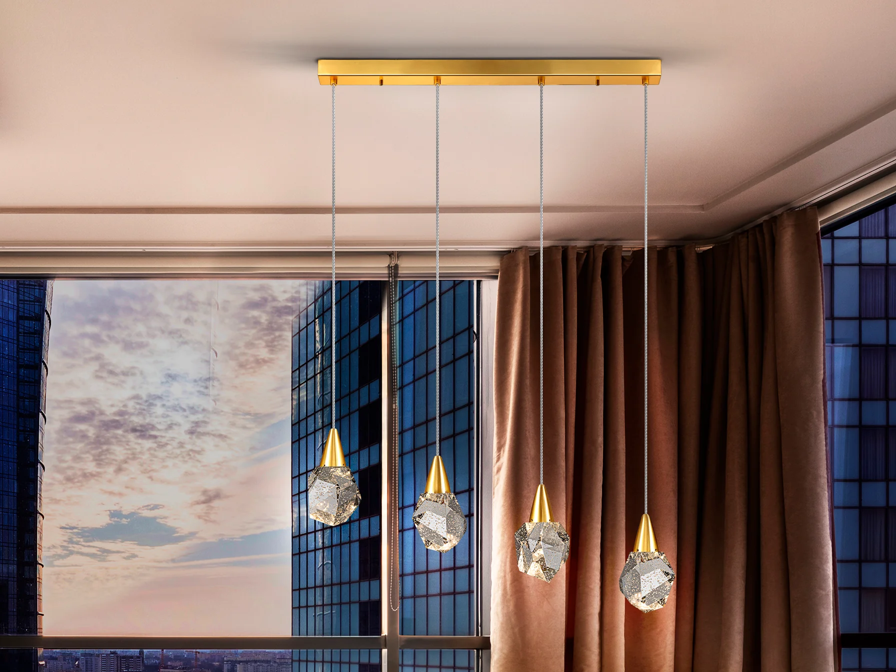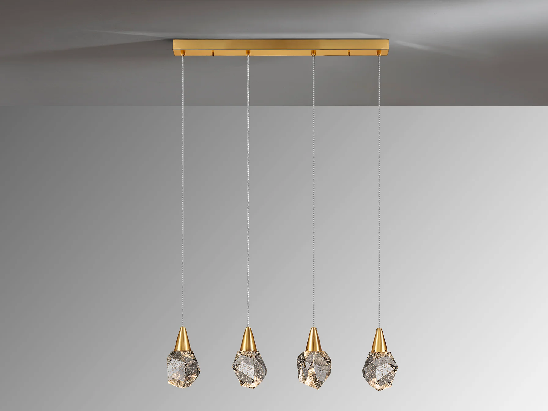 La lámpara Aquaria de Schuller redefine el concepto de luminaria en espacios modernos. Su estructura de metal acabado en oro mate combina elegancia discreta con una estética sofisticada que se funde armoniosamente en ambientes minimalistas o decoraciones de vanguardia. Las cuatro tulipas poliédricas de cristal macizo, con sus burbujas decorativas internas, crean un efecto visual tridimensional que descompone la luz en sutiles reflejos durante el día y una auténtica cascada de destellos al anochecer. Este diseño no solo ilumina, sino que convierte el techo en un punto focal arquitectónico, ideal para mesas de comedor extensas o islas de cocina donde se busca impacto visual sin sobrecargar el espacio.