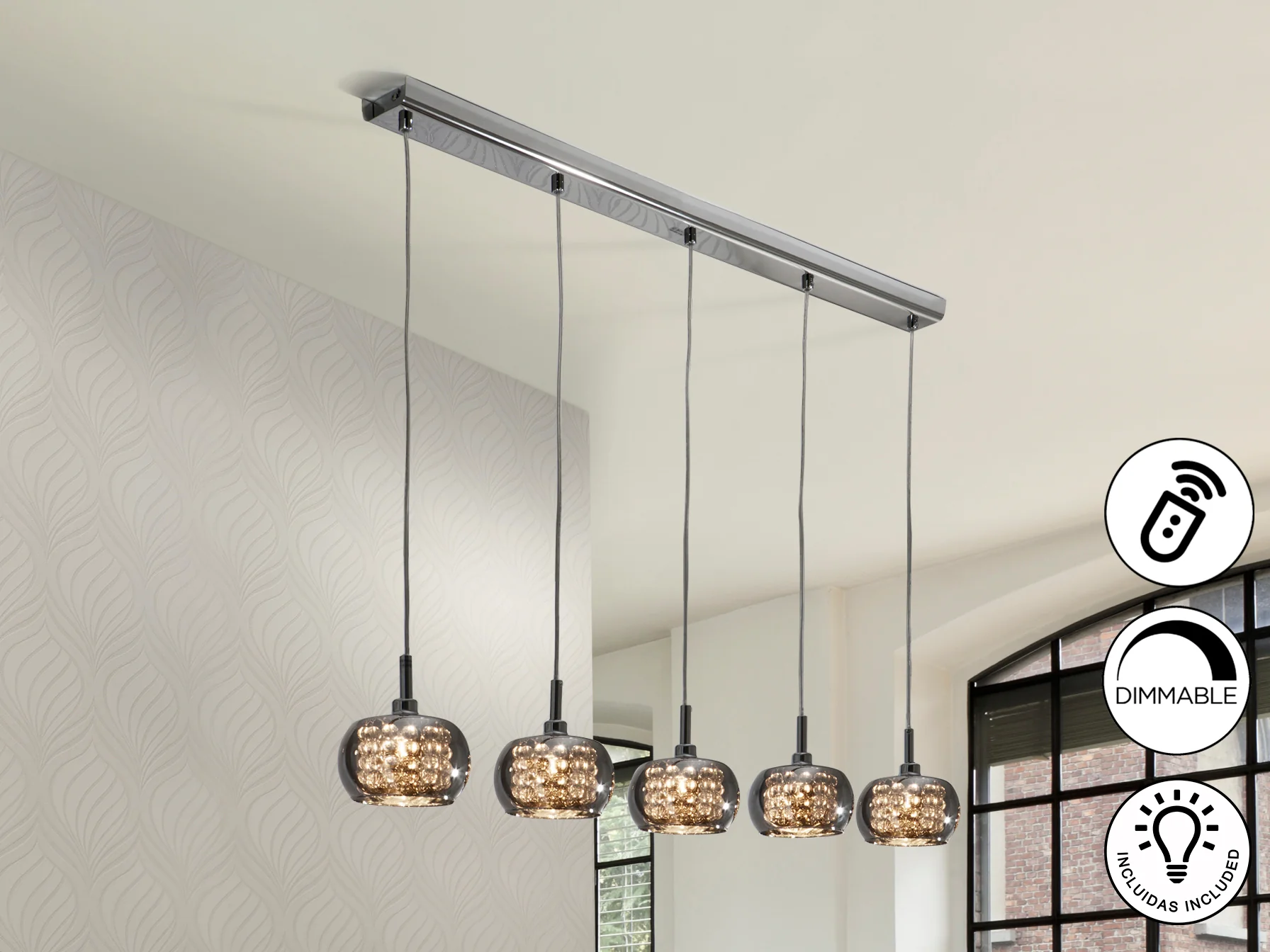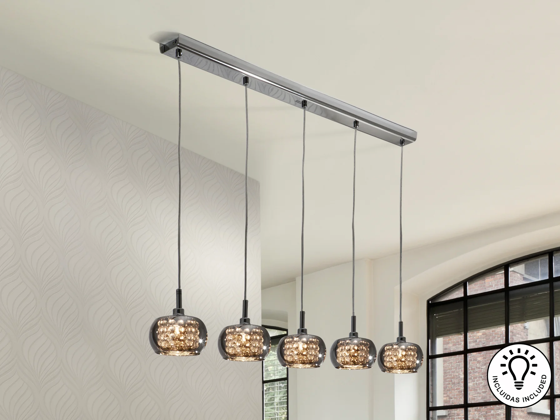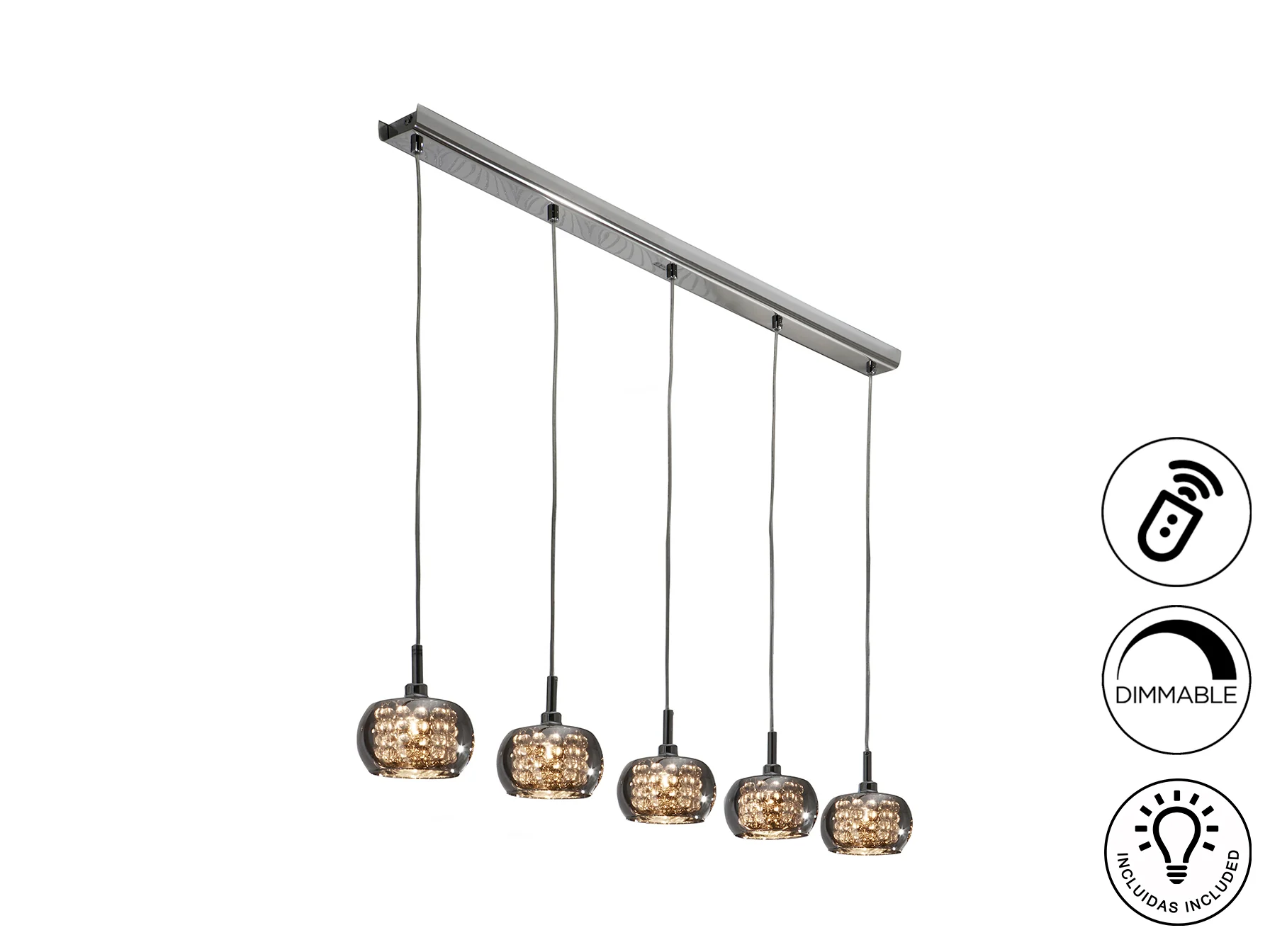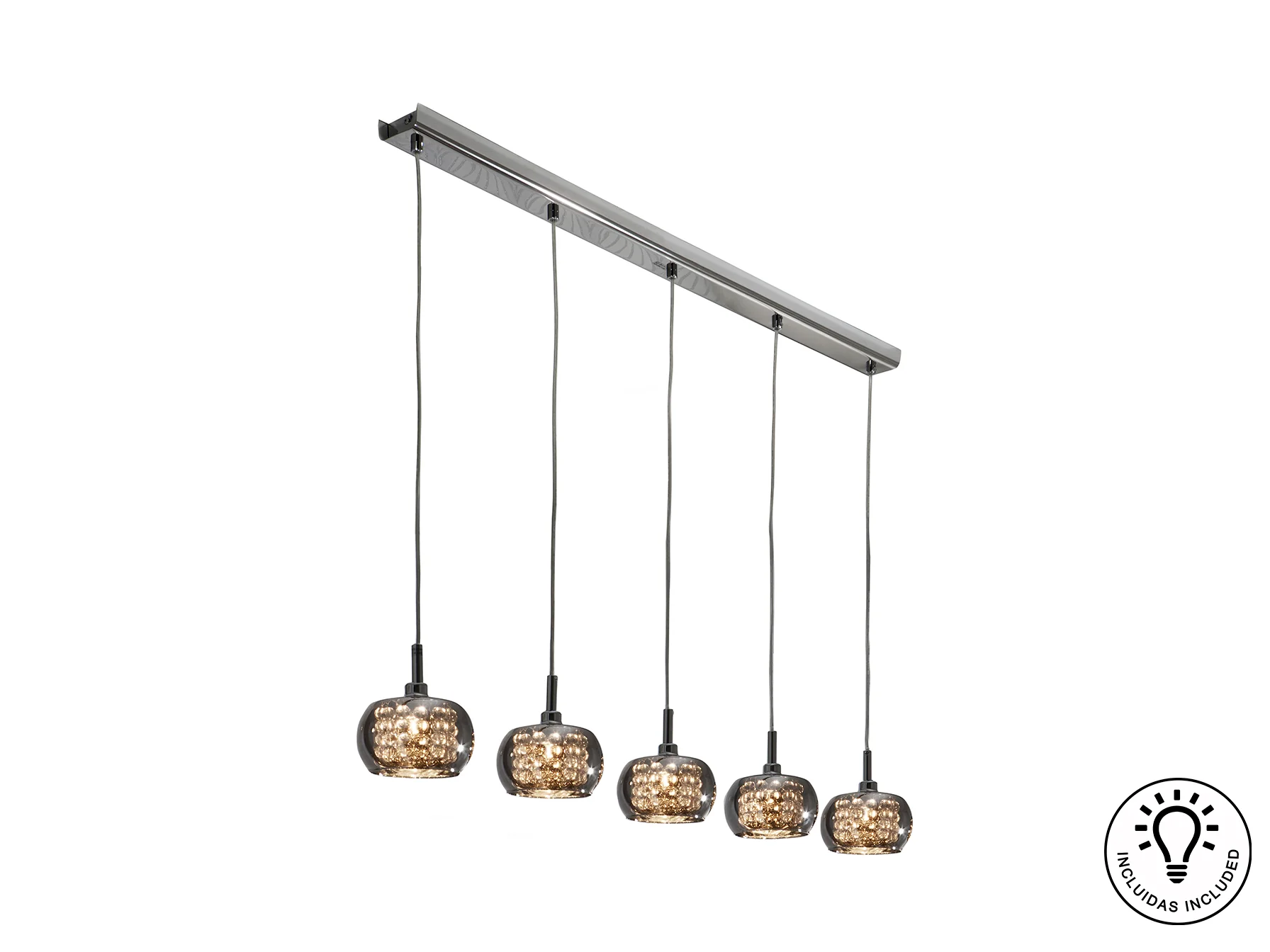La lámpara Arián destaca por su diseño moderno y el uso de materiales de alta calidad. El acero con acabado brillo proporciona una estructura sólida y elegante, mientras que las tulipas de cristal espejado, adornadas con tiras de cuentas de cristal en su interior, difunden la luz de manera suave y atractiva. Esta combinación crea un efecto lumínico deslumbrante, ideal para iluminar y decorar cualquier espacio con estilo.