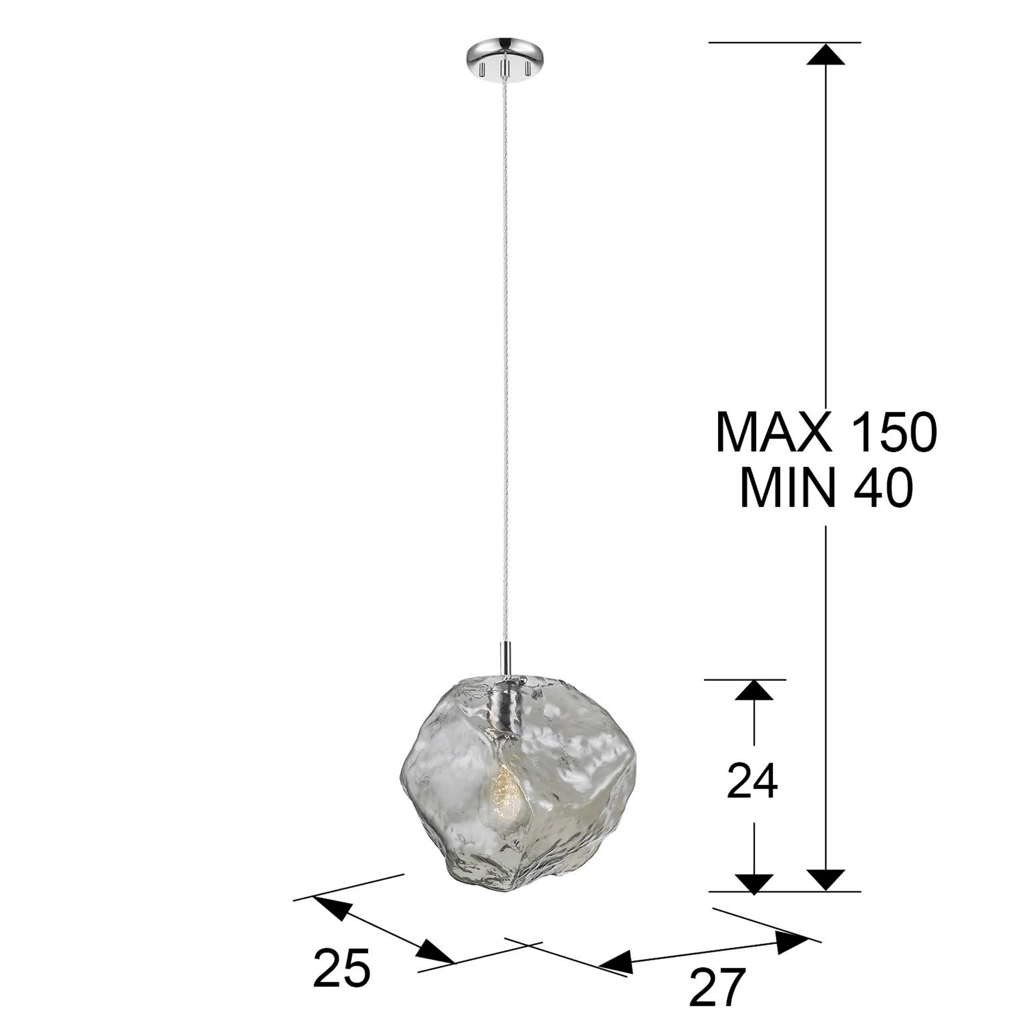 La lámpara Petra destaca por su cuidada selección de materiales. El metal cromado aporta un brillo sutil y duradero, mientras que el cristal smoke claro difumina la luz de manera suave y elegante, creando un ambiente relajante. Su diseño colgante la convierte en el centro de atención, aportando un toque de modernidad a cualquier estancia.