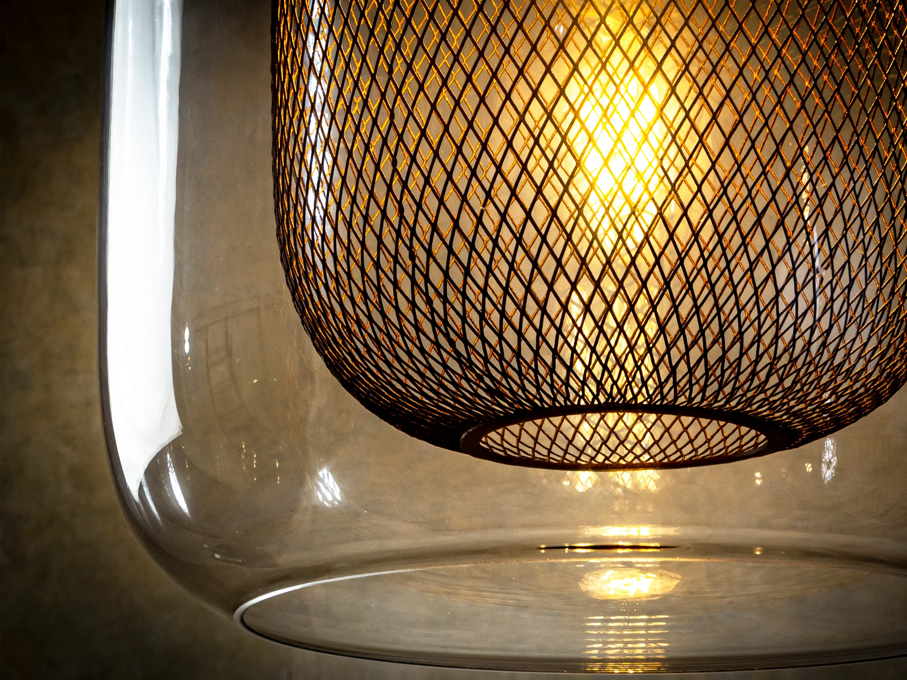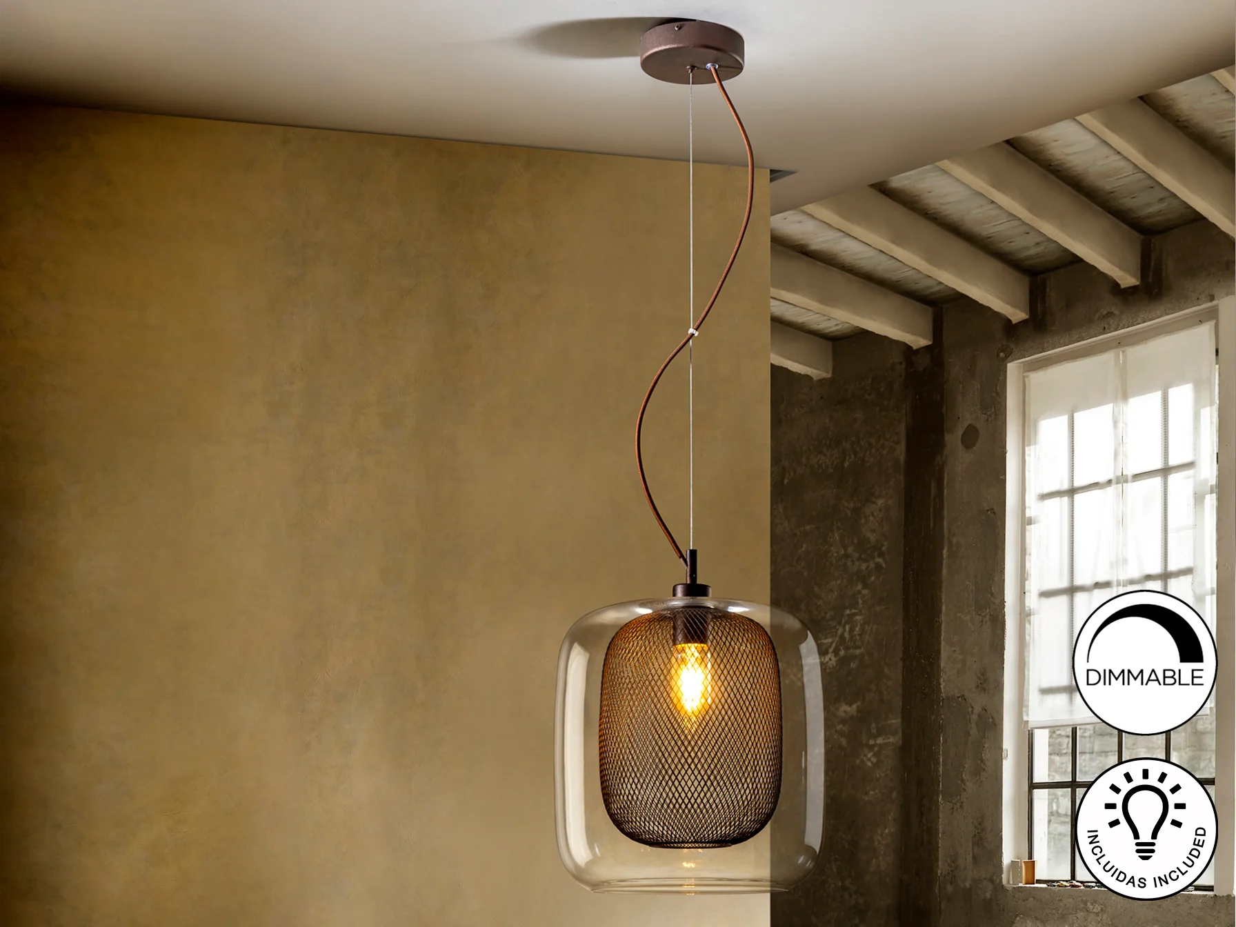 La lámpara Fox destaca por su cuidada selección de materiales. El metal lacado en color chocolate aporta robustez y un toque cálido, mientras que la doble tulipa de cristal, con su interior de malla metálica, difumina la luz de manera uniforme, evitando deslumbramientos y creando una atmósfera agradable. Su diseño colgante la convierte en el centro de atención de cualquier estancia.