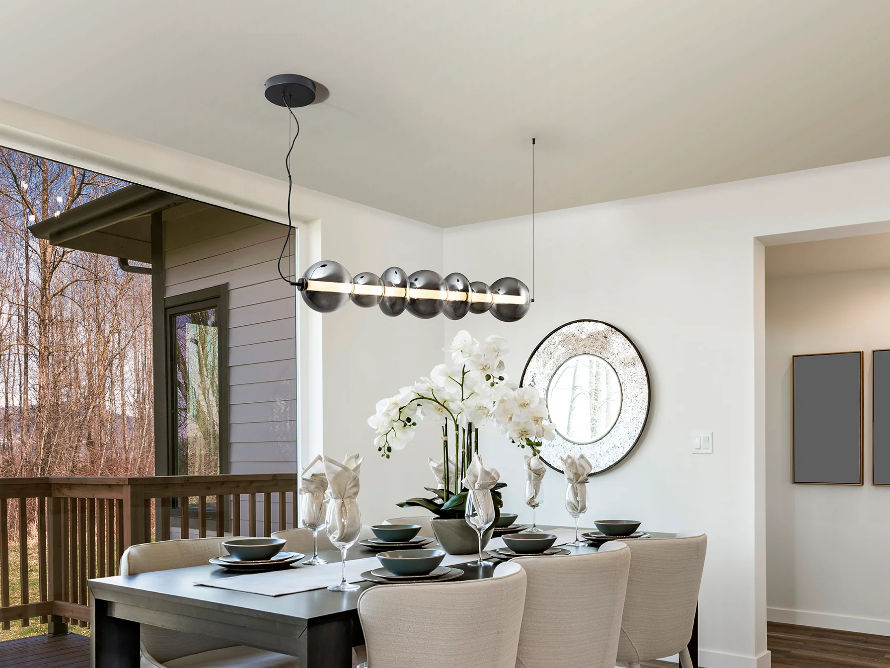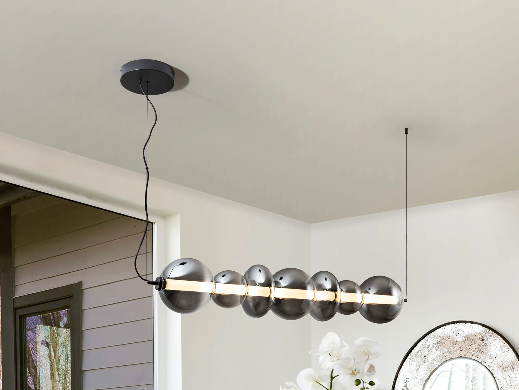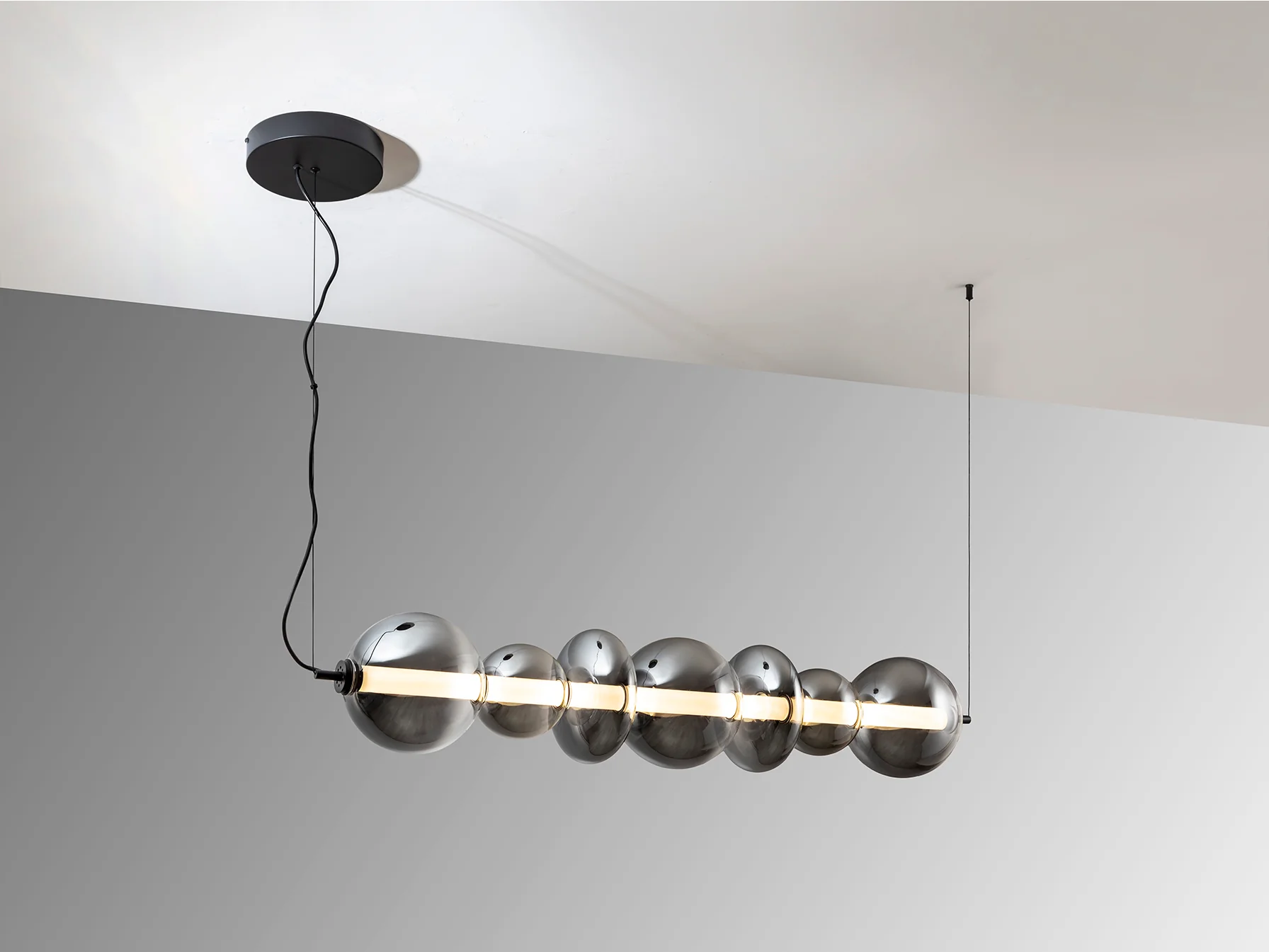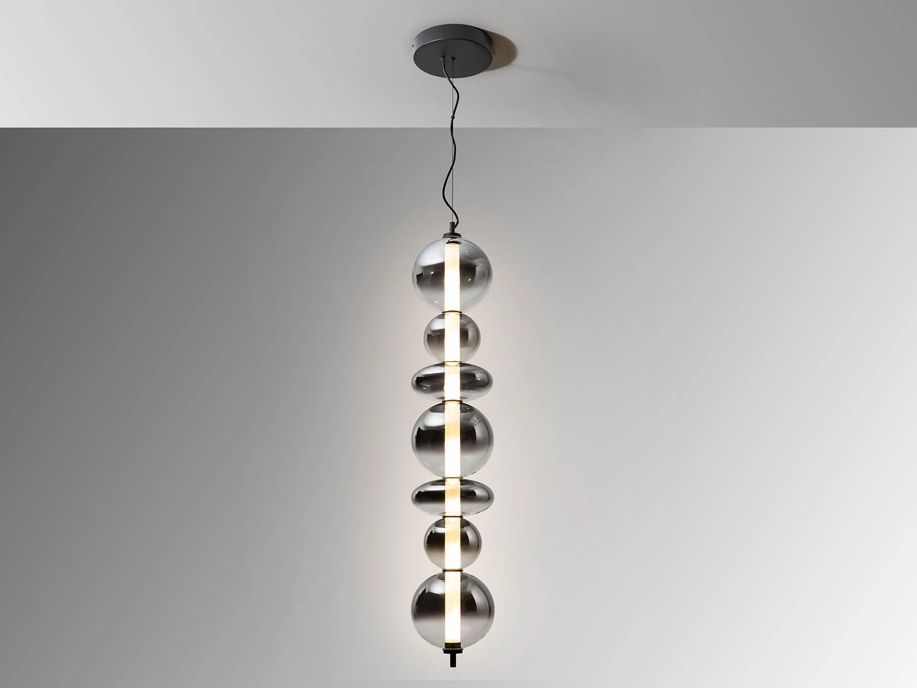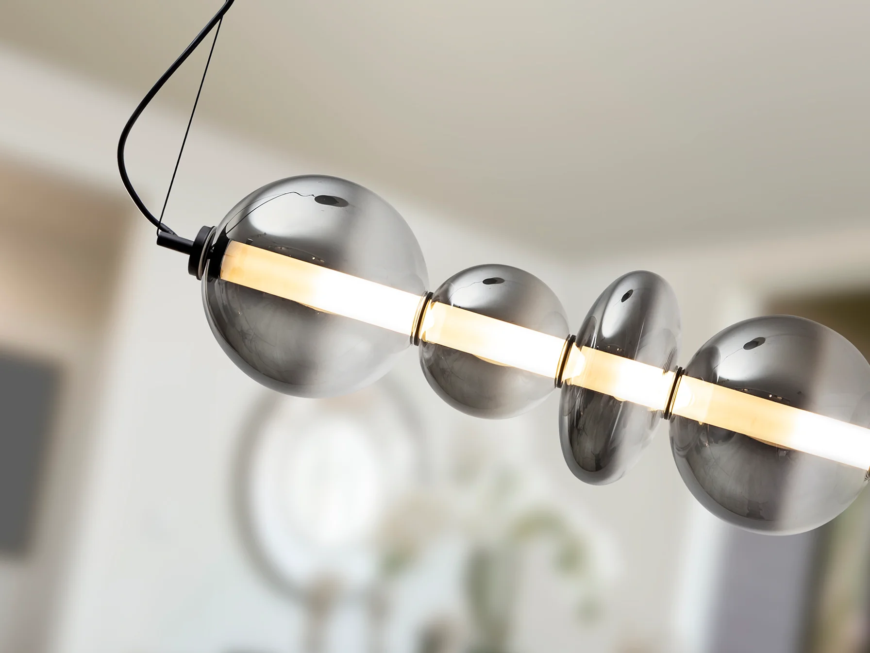 Schuller, sinónimo de calidad premium y diseño exigente, ha creado la lámpara Gladis con una atención meticulosa a cada detalle. La estructura de metal con acabado negro mate ofrece una base sólida y moderna, mientras que las tulipas de cristal soplado en gris smoke difuminado aportan un toque de misterio y sofisticación. El cilindro interior opal asegura una difusión de luz sedosa y uniforme, eliminando cualquier deslumbramiento molesto. La combinación de estos materiales crea una pieza atemporal que se integra a la perfección en cualquier estilo decorativo, desde el más minimalista hasta el más ecléctico. El cristal, frío al tacto, refleja la luz de manera sutil, creando un ambiente acogedor y relajante.