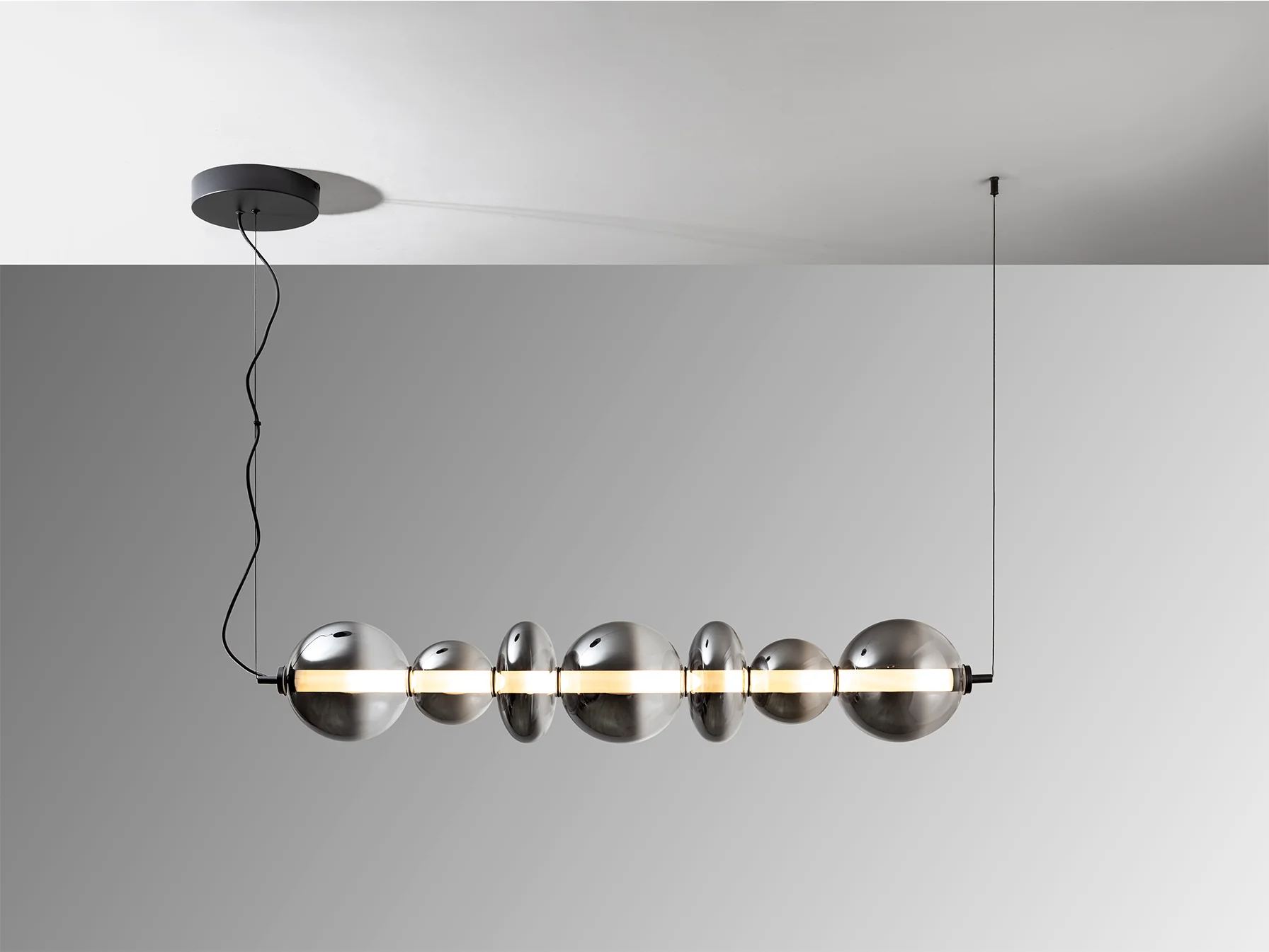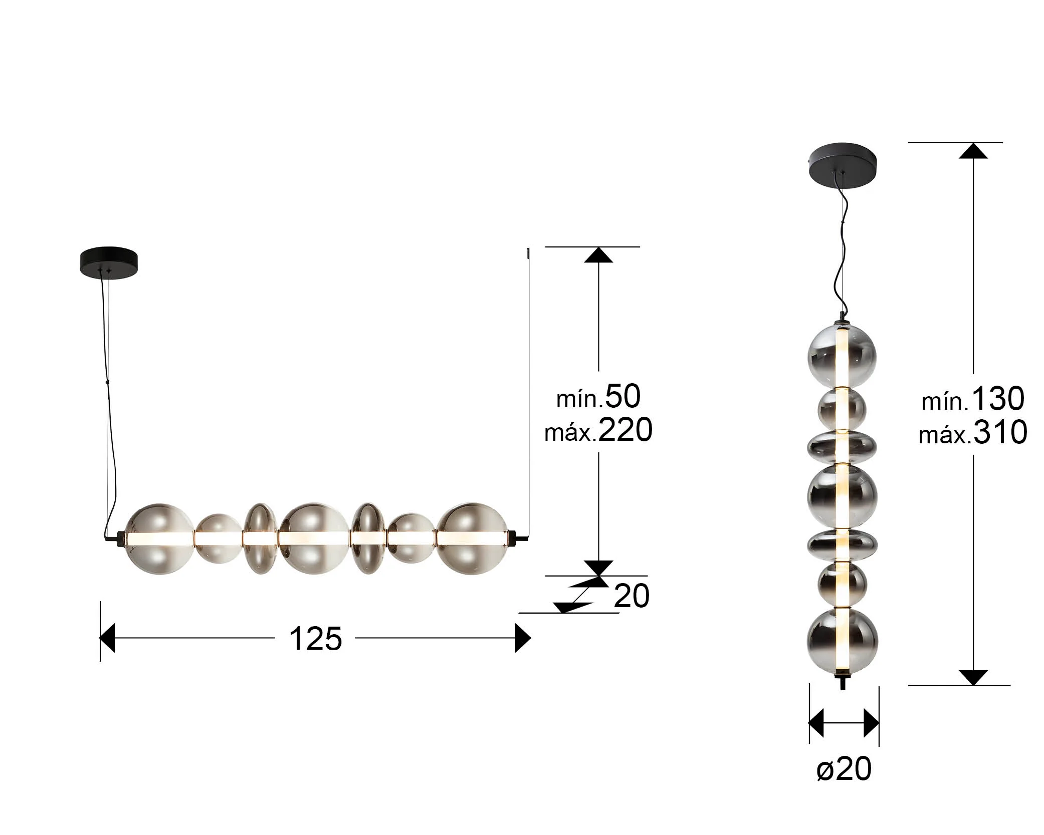 - Materiales de alta calidad: metal con acabado negro mate y cristal soplado.