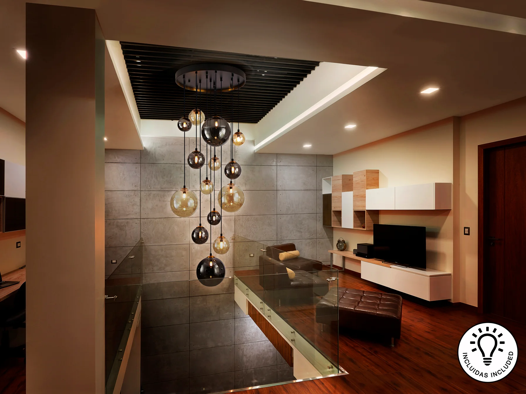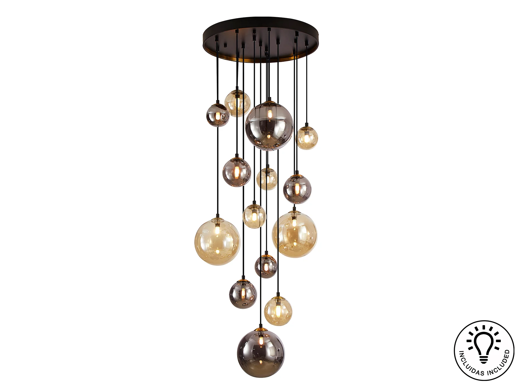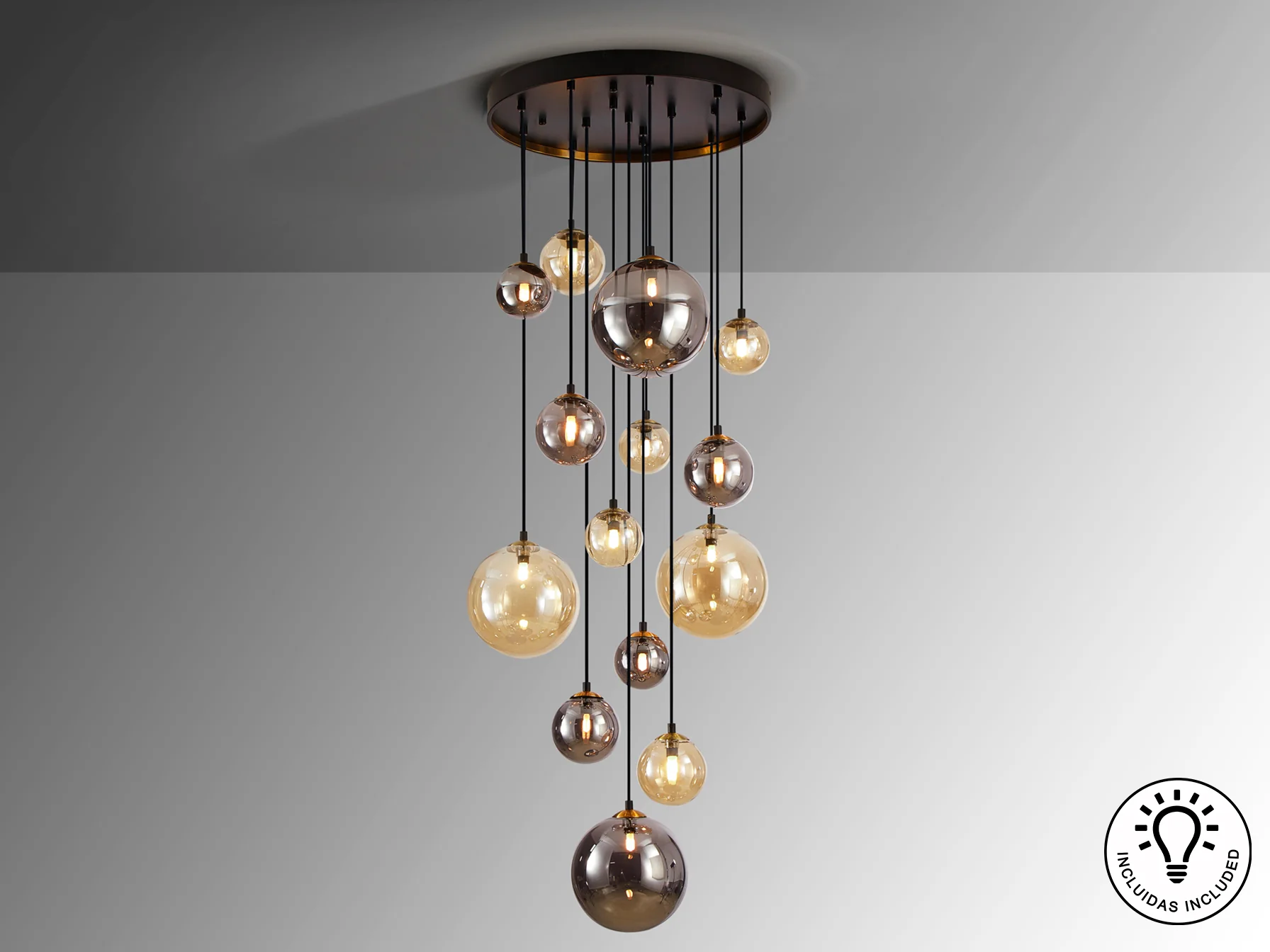 - Luz cálida y acogedora gracias a sus tulipas de cristal en tonos ámbar y gris humo.