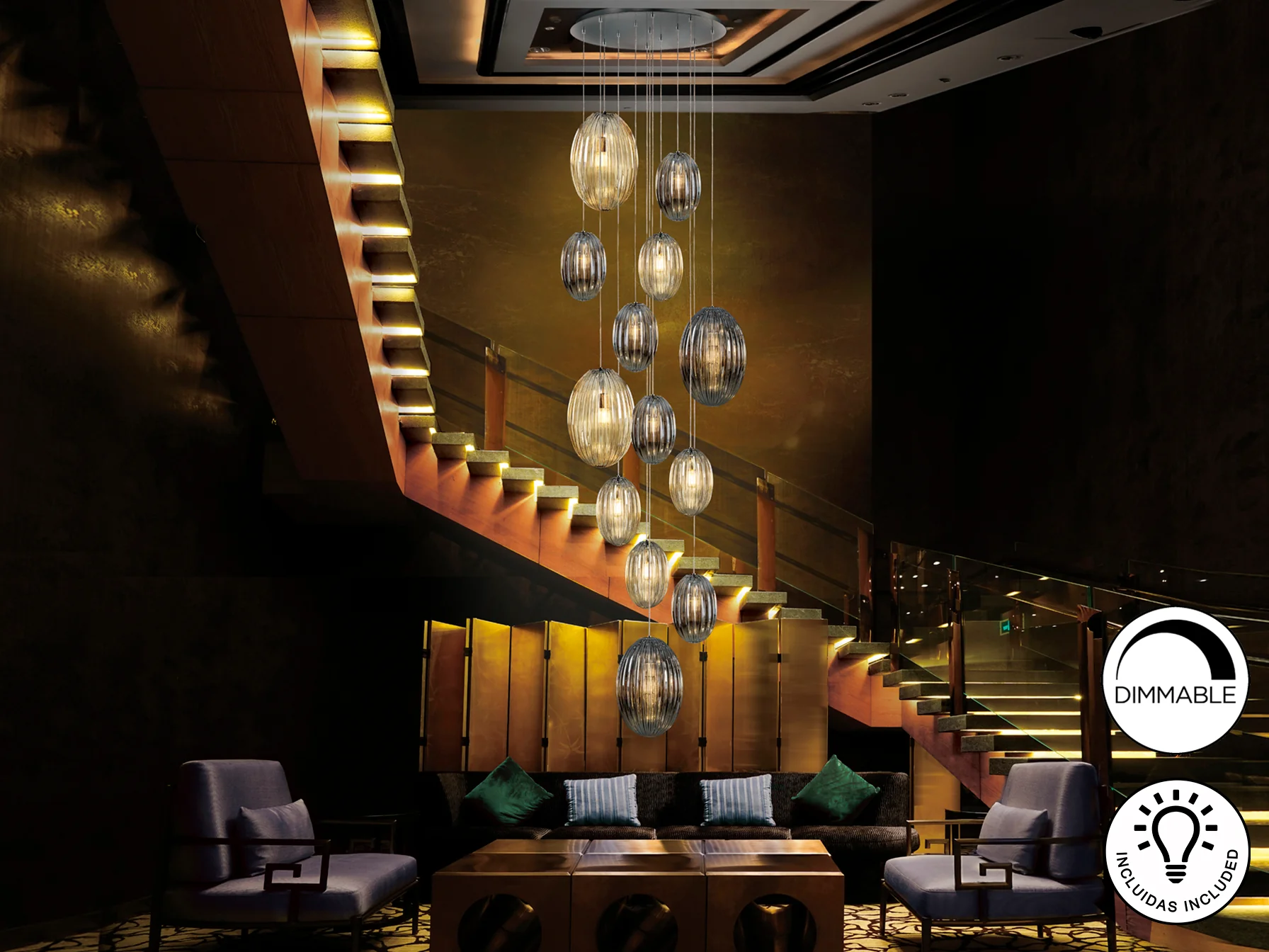 • Luz cálida y acogedora gracias a sus tulipas de cristal en tonos coñac y gris smoke.