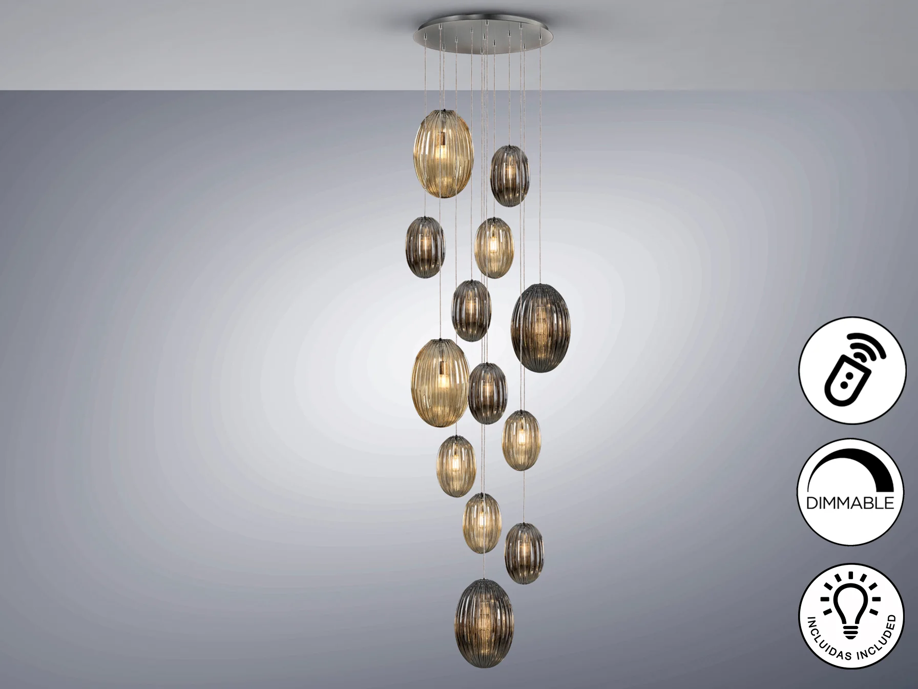 La lámpara Ovila destaca por su cuidada selección de materiales. El metal cromado aporta un toque moderno y elegante, mientras que las tulipas de cristal en dos tonalidades (coñac y gris smoke) difuminan la luz de manera suave y atractiva. La combinación de tulipas grandes y pequeñas crea un juego de luces y sombras que añade profundidad y dinamismo al ambiente.