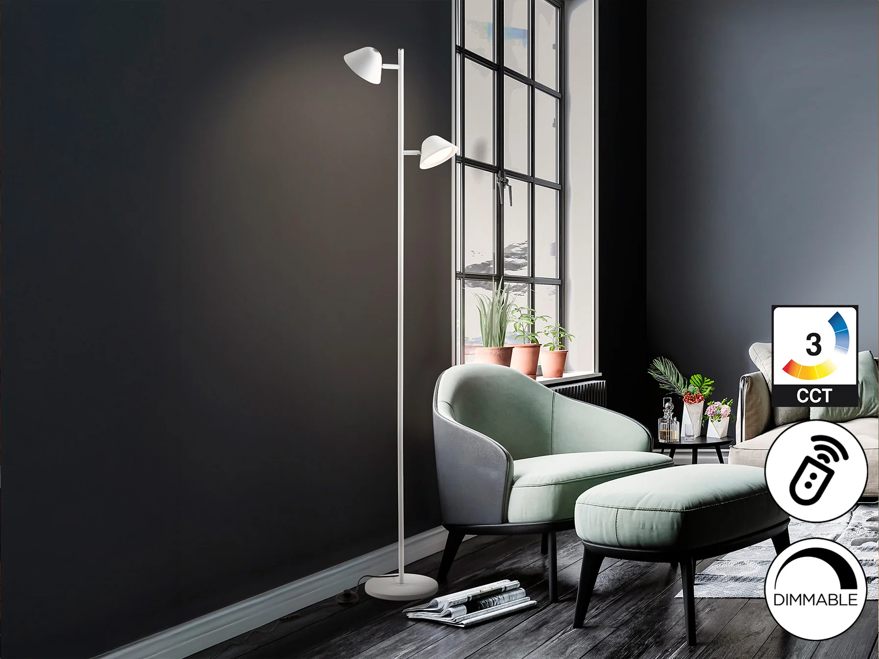 La lámpara de pie Taros ofrece una experiencia lumínica personalizada. Sus dos luces orientables te permiten dirigir la luz hacia donde más la necesitas, ya sea para leer, trabajar o simplemente relajarte. La función dimable te permite ajustar la intensidad de la luz a tu gusto, creando ambientes íntimos o luminosos según la ocasión. Además, la temperatura de color regulable te permite elegir entre una luz cálida para momentos de relax o una luz fría para actividades que requieren mayor concentración. El control remoto intuitivo facilita el manejo de todas estas funciones, brindándote un control total sobre la iluminación de tu salón.