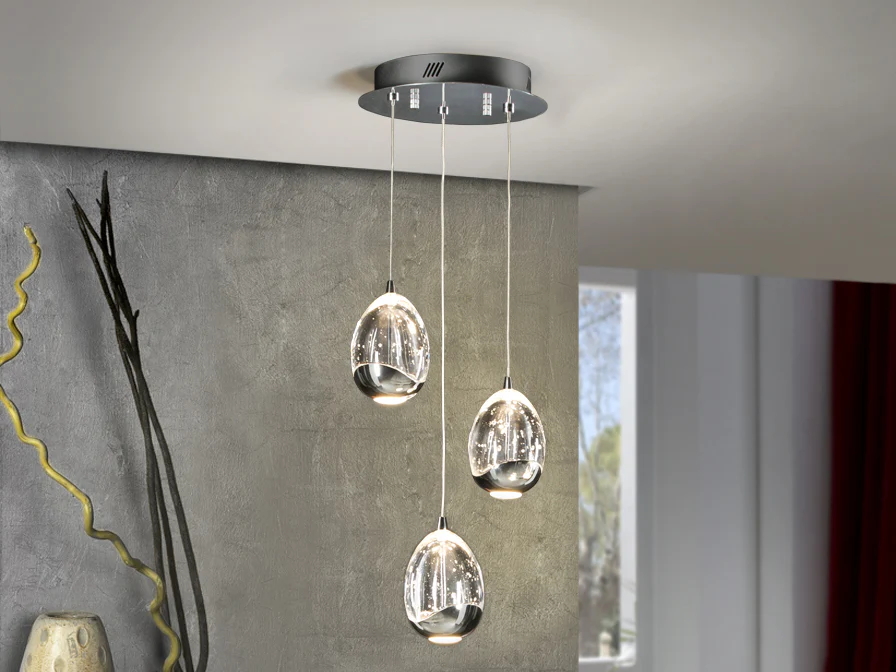 La lámpara Rocío de Schuller es una obra maestra de la iluminación moderna. Su estructura de metal con acabado cromo ofrece un brillo sutil y elegante, complementado a la perfección por las tulipas de cristal macizo. Estas tulipas, con su forma de gota y burbujas decorativas en su interior, crean un efecto visual fascinante, difundiendo la luz de manera suave y uniforme. El metal, frío al tacto y robusto, garantiza durabilidad y resistencia al paso del tiempo, mientras que el cristal añade un toque de lujo y sofisticación. Schuller, sinónimo de calidad premium y diseño exigente, ha cuidado cada detalle para ofrecer una lámpara que no solo ilumina, sino que también embellece.