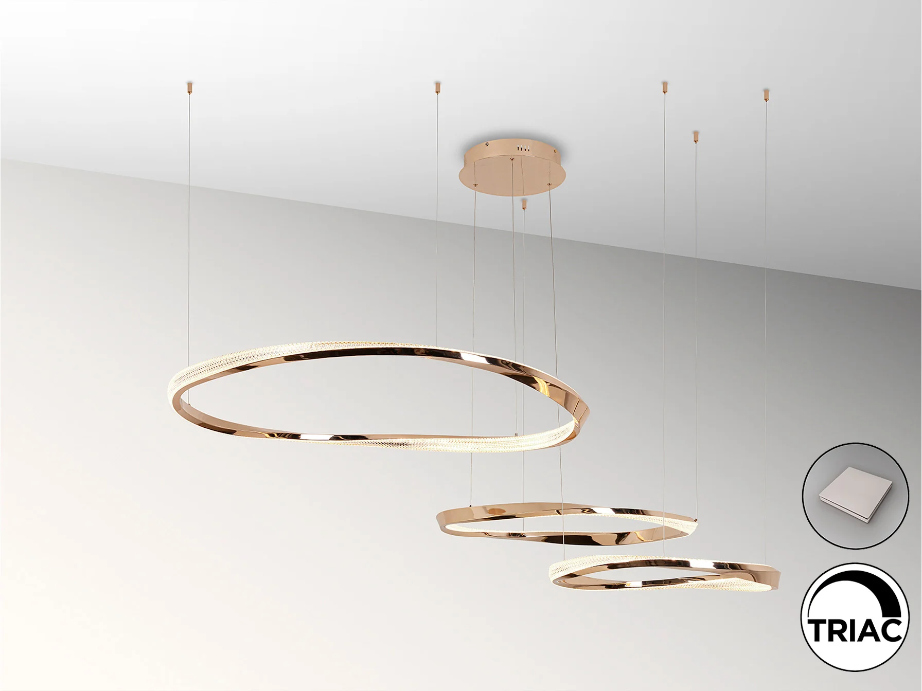 La lámpara Orbitas destaca por su construcción en aluminio y metal con un lujoso baño dorado brillante. El difusor de acrílico facetado transparente asegura una distribución uniforme de la luz, evitando deslumbramientos y creando un ambiente agradable. Su diseño de tres aros de diferentes tamaños (Ø55, Ø70, Ø85 cm) aporta dinamismo y sofisticación al espacio. La tecnología LED de 120W proporciona una iluminación potente y eficiente, con una larga vida útil.