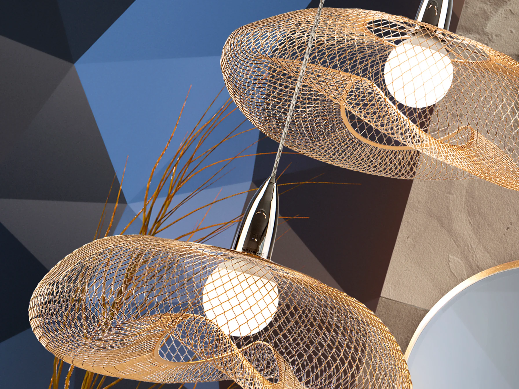Esta lámpara de una luz destaca por su construcción en metal de alta calidad, con un acabado en cromo y oro brillo que refleja la luz de manera espectacular. La tulipa de malla metálica en oro brillo difumina la luz, creando un ambiente suave y agradable. Su diseño moderno la convierte en una pieza central en cualquier espacio.