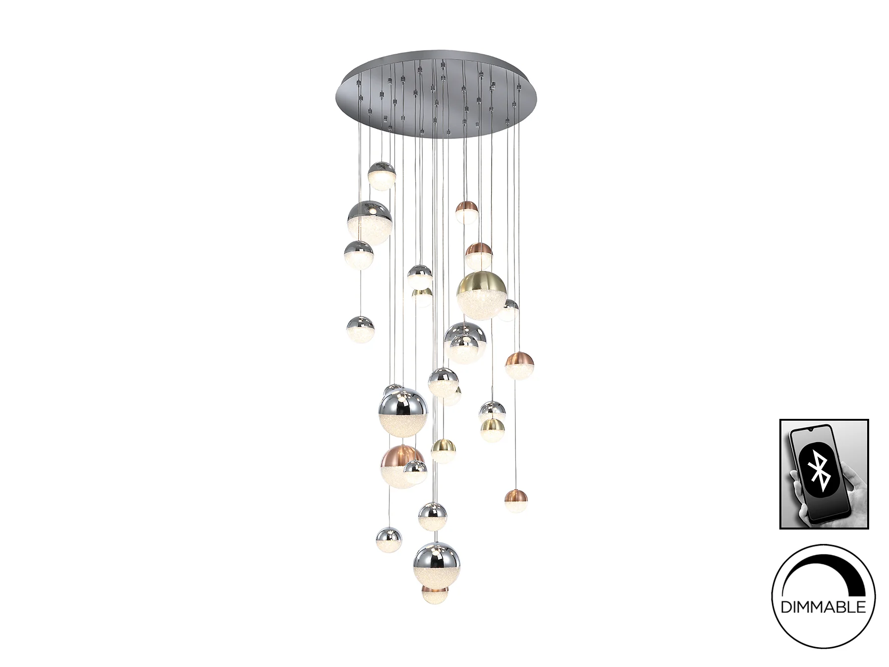 La Lamp.27l Led·sphere·colø80 Dim destaca por su diseño innovador y la calidad de sus materiales. Su estructura de metal cromado soporta 27 luces LED, cada una con tulipas de policarbonato texturizado que difunden una luz suave y uniforme. Los acabados en cobre y latón satinado añaden un toque de calidez y sofisticación, creando un ambiente acogedor y elegante. Esta lámpara no solo ilumina, sino que también decora, convirtiéndose en el centro de atención de cualquier espacio.