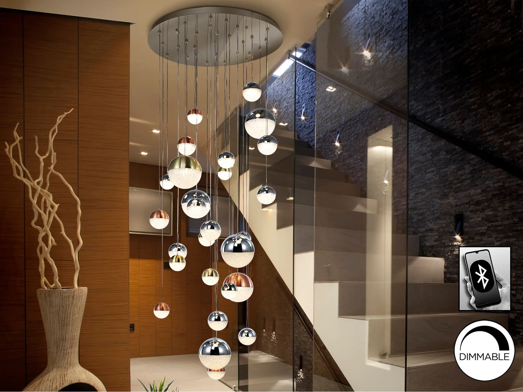 Schuller, sinónimo de calidad premium y diseño exigente, presenta esta lámpara Sphere con una construcción impecable. Las 27 luces LED se alojan en tulipas de policarbonato de diferentes diámetros (10, 12 y 20 cm), cuyo interior texturizado crea un efecto lumínico único. El metal, presente en acabados de cromo, cobre y latón satinados, aporta un toque de distinción y robustez. El acabado robusto del metal, frío al tacto, garantiza una resistencia al paso del tiempo, mientras que el policarbonato asegura una difusión de luz sedosa, evitando deslumbramientos y creando una atmósfera acogedora.