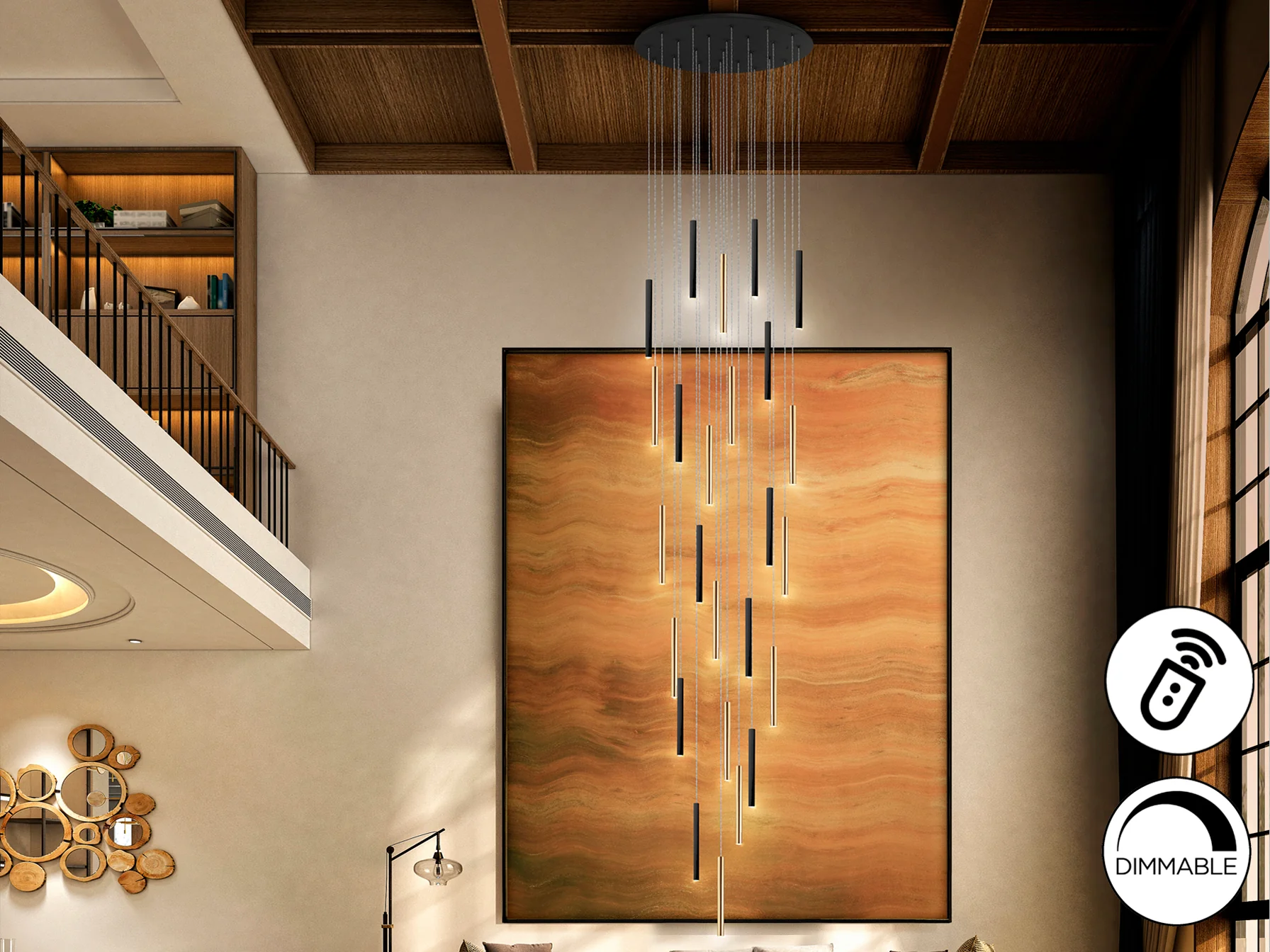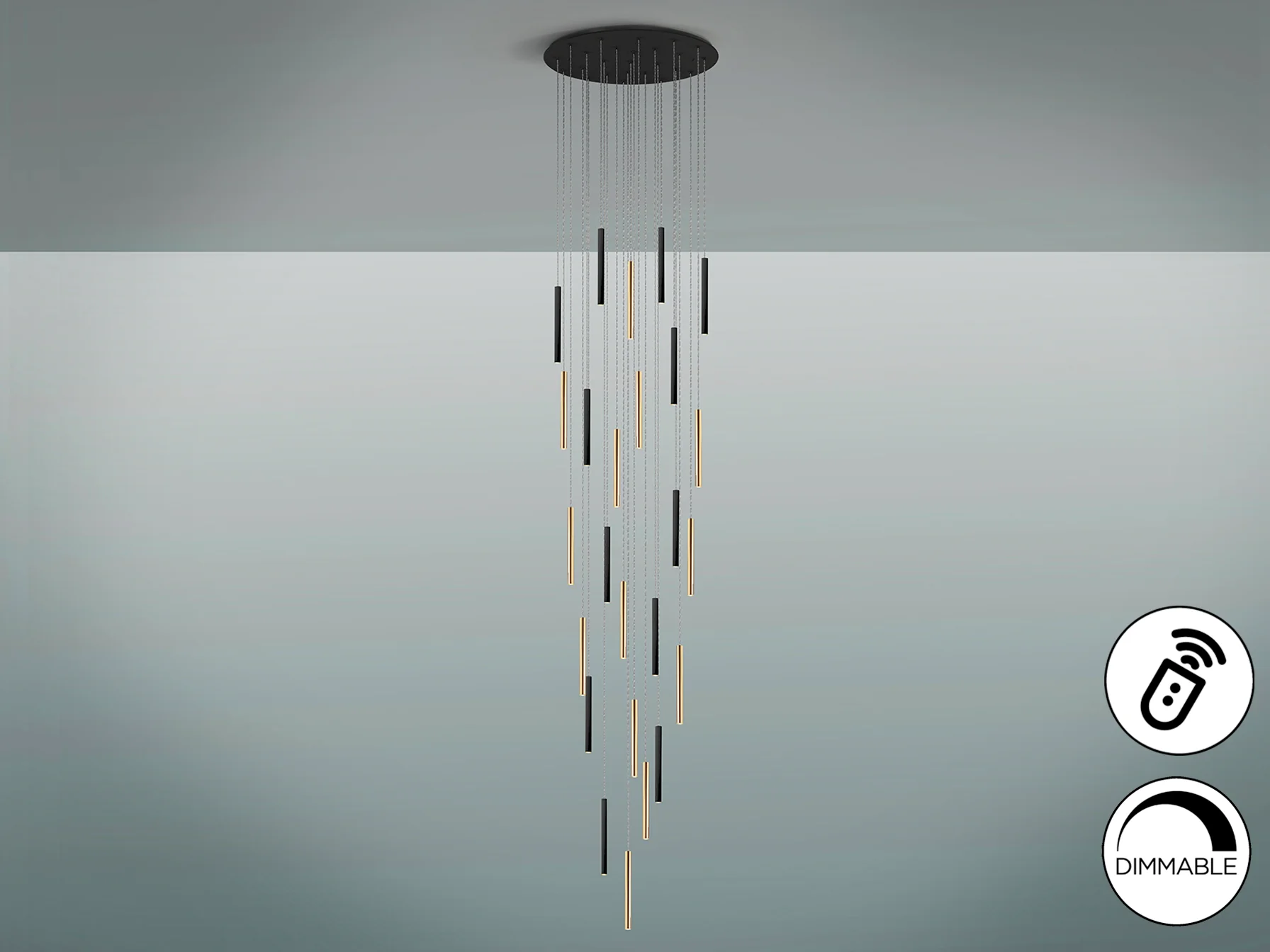 La Gran Lámpara Varas redefine la iluminación interior, fusionando el lujo del oro y la sobriedad del negro en una pieza central deslumbrante. Sus 25 luces LED, dispuestas en un diseño circular, emiten una luz cálida y envolvente, transformando cualquier salón en un espacio acogedor y sofisticado. Perfecta para quienes buscan una iluminación moderna y con carácter, esta lámpara colgante se convierte en una declaración de estilo.