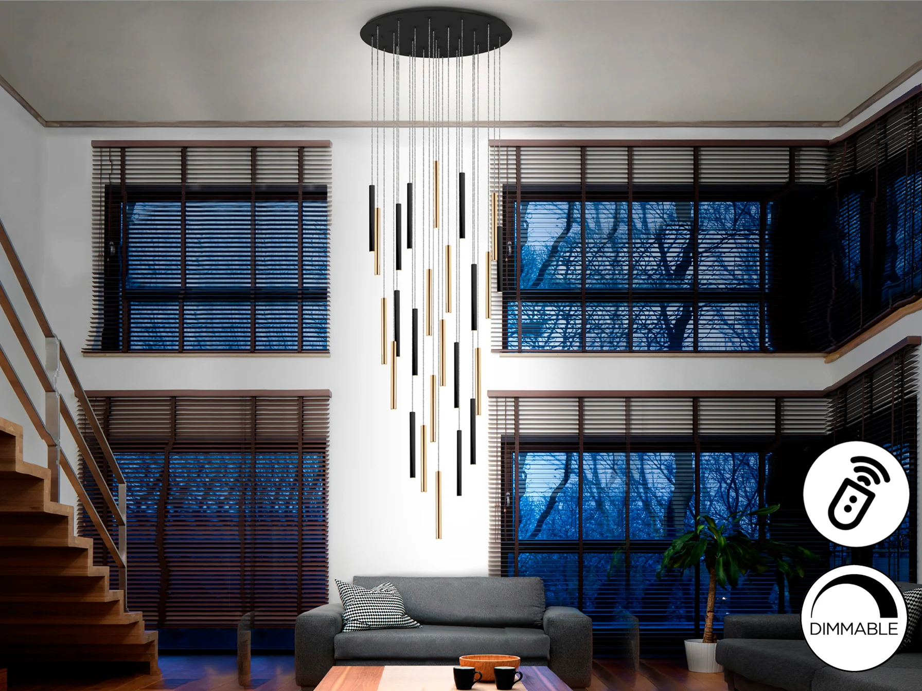 La lámpara colgante ‘Varas’ de Schuller redefine la iluminación interior, fusionando diseño moderno y funcionalidad. Sus 25 luces LED, dispuestas en una estructura de metal con acabados en negro mate y oro brillo, crean un ambiente cálido y acogedor. Perfecta para salones y comedores, esta lámpara no solo ilumina, sino que también se convierte en una pieza central de decoración, aportando un toque de lujo y distinción a tu hogar.