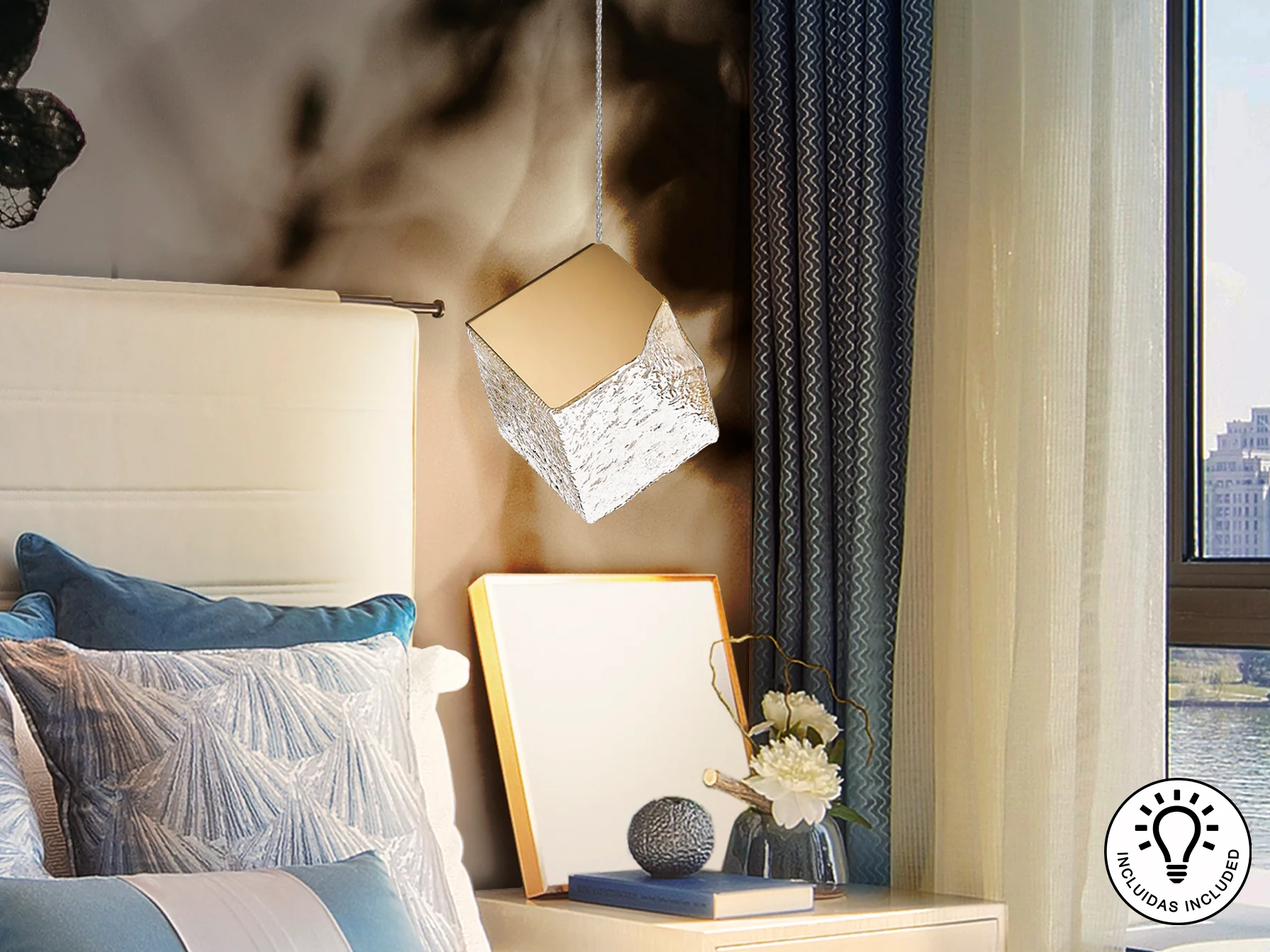 Lámpara de 1 luz realizada en metal y acero acabado oro. Tulipa cúbica de cristal texturizado. Regulable en altura.