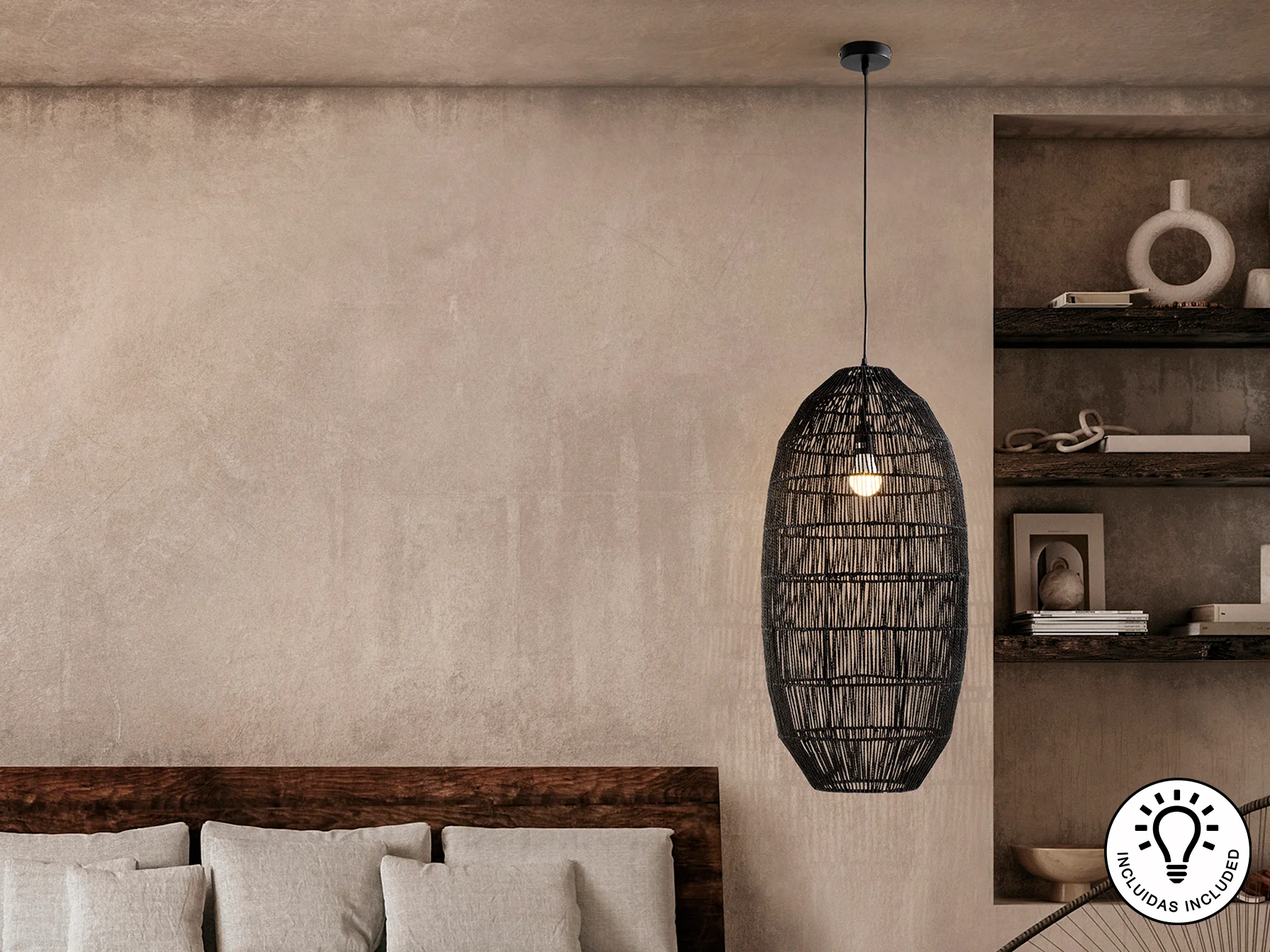 En LuzGuru te ofrecemos la lámpara Tizne, un diseño excepcional de Schuller. Esta lámpara de suspensión grande, de una sola luz (E27), combina la resistencia del metal con la calidez de una pantalla encordada en fibra de papel. Su acabado negro mate le confiere un aire sofisticado y contemporáneo. Perfecta para iluminar salones, dormitorios o comedores, creando un ambiente acogedor y lleno de estilo. La Tizne es más que una lámpara; es una declaración de estilo. Descubre la gama completa en LuzGuru y transforma tu espacio con la calidad y el diseño de Schuller. Con una potencia de 40W y 900 lúmenes, proporciona una iluminación cálida y eficiente (3000K).