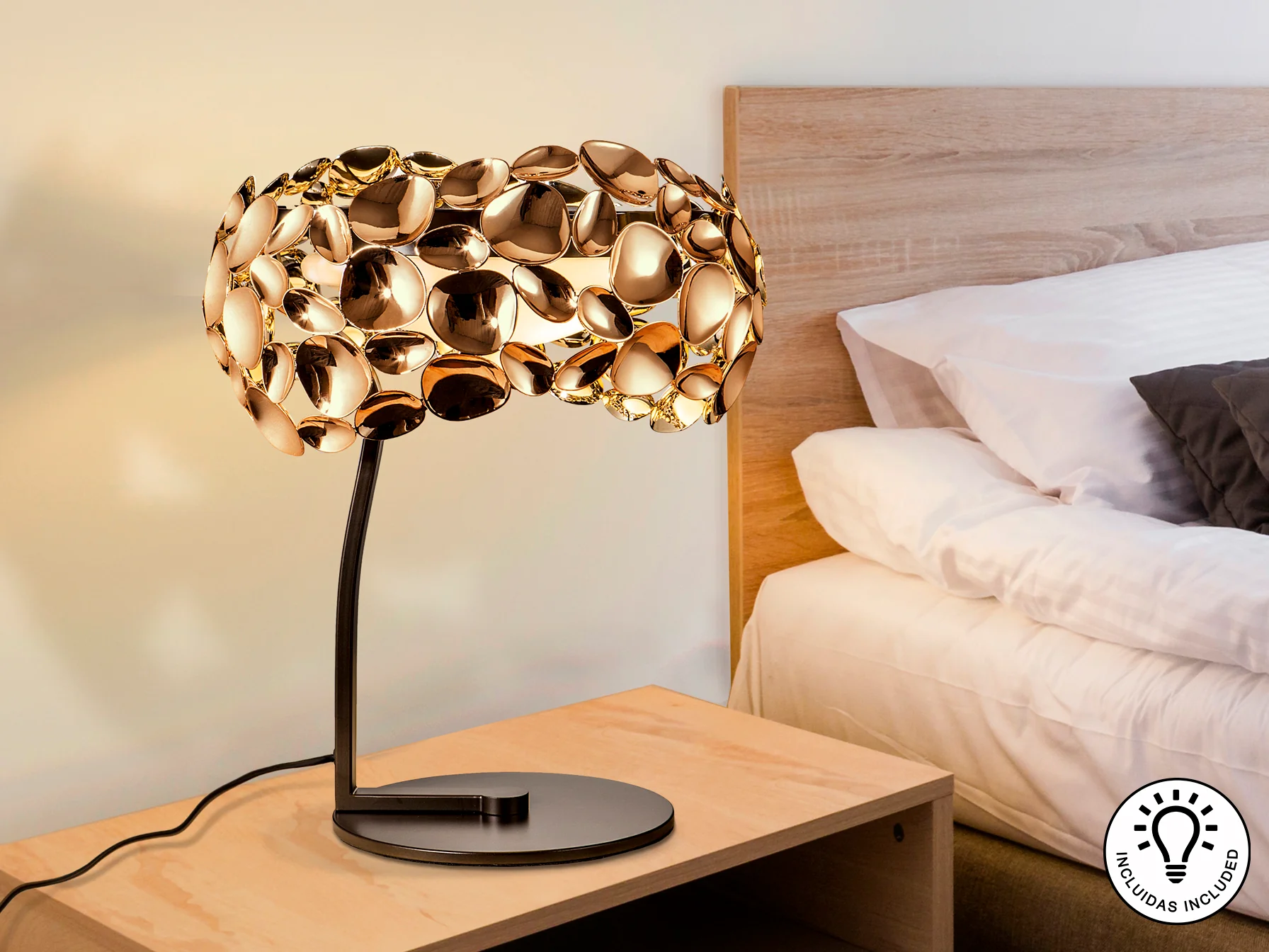 Esta lámpara de sobremesa está diseñada para ser colocada sobre cualquier superficie plana, como mesas auxiliares, escritorios o mesitas de noche. Para mantener su brillo y elegancia, límpiala regularmente con un paño suave y seco. Evita el uso de productos abrasivos que puedan dañar el acabado.