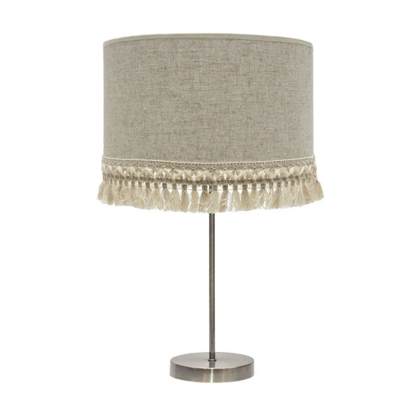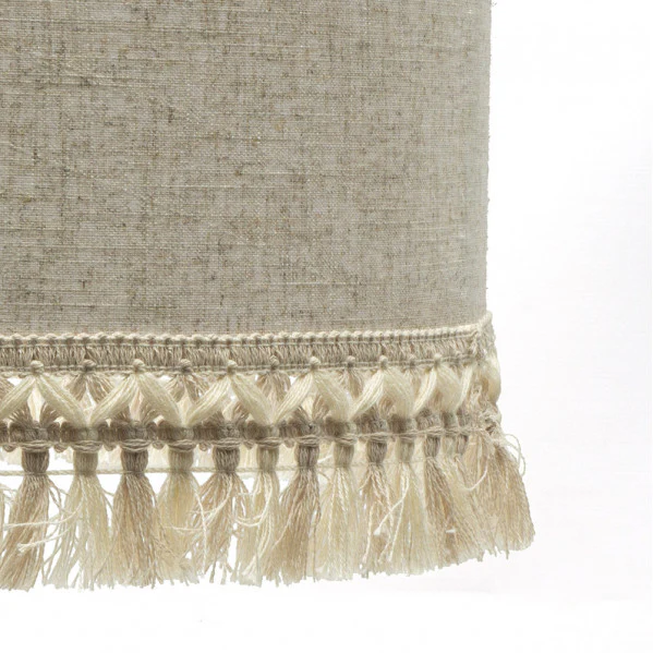 • Pantalla de Textil de Lino Rayado con Flecos: Proporciona una luz difusa general que crea ambientes relajantes, ideal para interiores sin fatiga visual.
