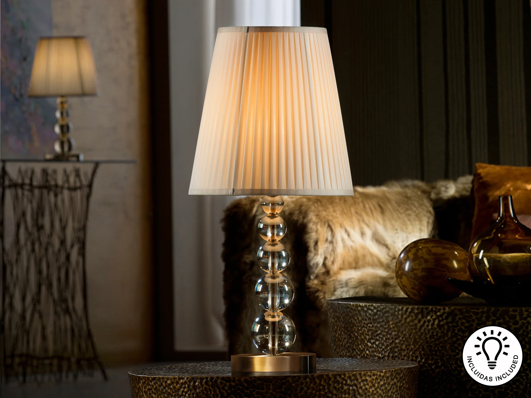 La combinación de cristal champán, latón envejecido y una pantalla encintada en color beige crea un efecto lumínico suave y difuso, ideal para ambientes relajados. Los materiales de alta calidad aseguran durabilidad y un aspecto lujoso. Su tamaño generoso la convierte en el punto focal perfecto para cualquier mesa auxiliar o consola.