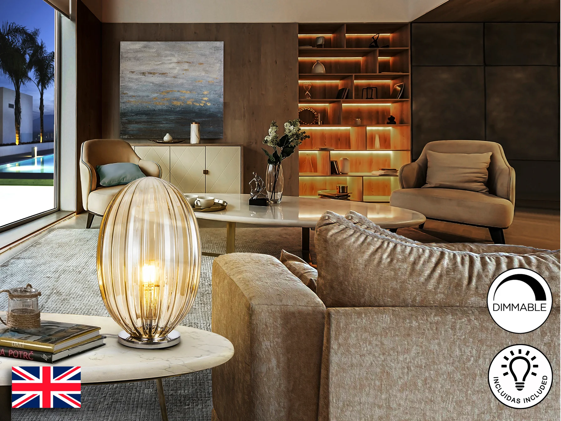 La lámpara de sobremesa Ovila se instala fácilmente en cualquier superficie plana. Para mantener su brillo y apariencia, se recomienda limpiar regularmente con un paño suave y seco. Evitar el uso de productos abrasivos que puedan dañar el acabado cromado o el cristal.